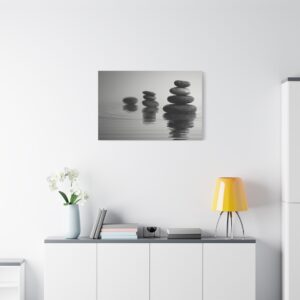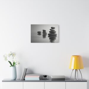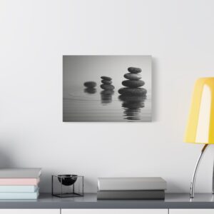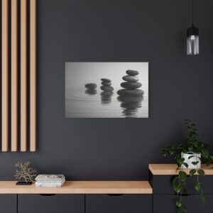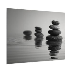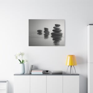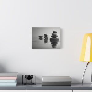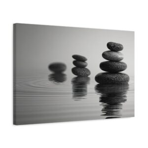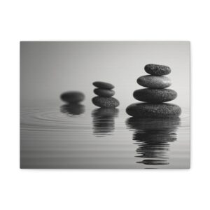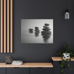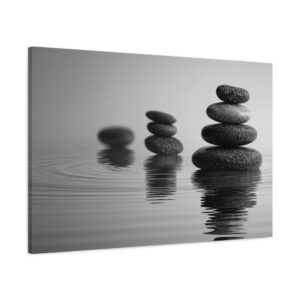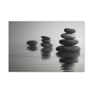 Plongez dans une atmosphère de sérénité avec ce tableau Zen Pierres dans l’eau. Cette composition monochromatique en noir et blanc dépeint une scène de méditation zen avec des pierres lisses équilibrées dans une eau calme. Les reflets et ondulations parfaits sur l’eau créent un effet miroir, apportant un moment de tranquillité et de pleine conscience. Avec ses doux dégradés, ce tableau évoque une atmosphère de spa minimaliste, idéale pour apporter une touche de calme et de raffinement à votre intérieur.