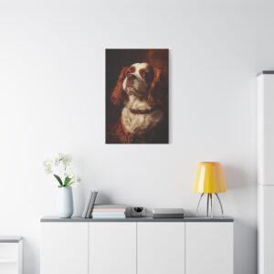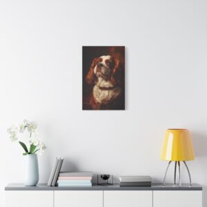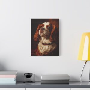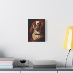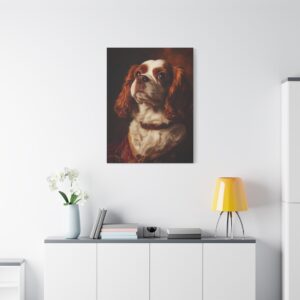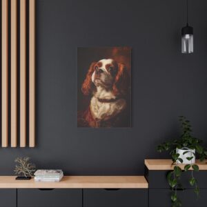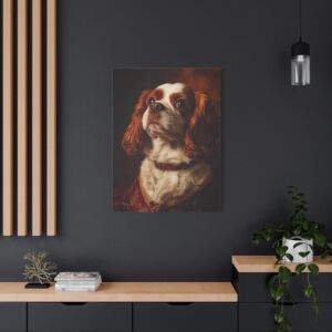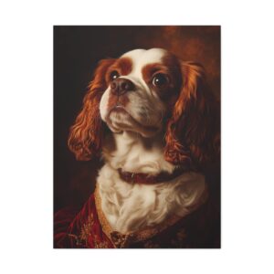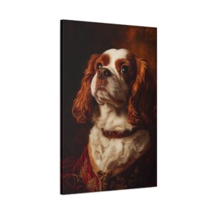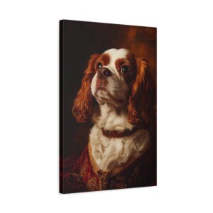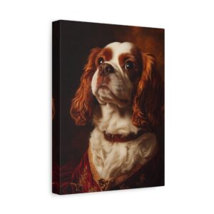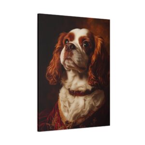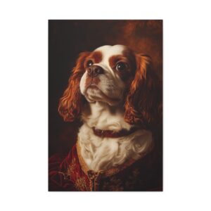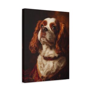 Découvrez ce portrait aristocratique de Cavalier King Charles dans la plus pure tradition du XVIIIe siècle. Sur un fond de velours bordeaux somptueux, ce noble compagnon pose avec grâce, ses longues oreilles soyeuses et son regard doux capturés avec une précision remarquable par le style des grands maîtres.