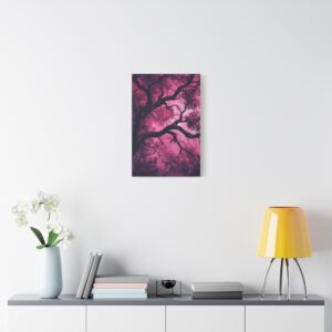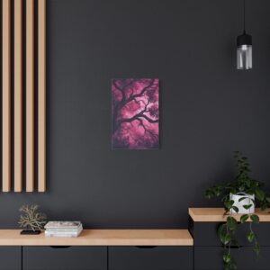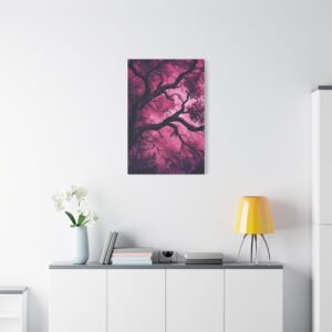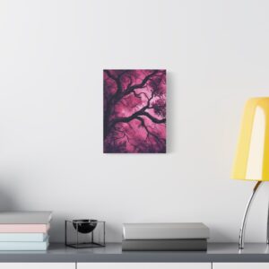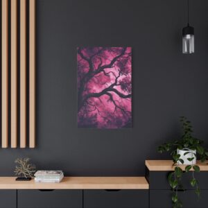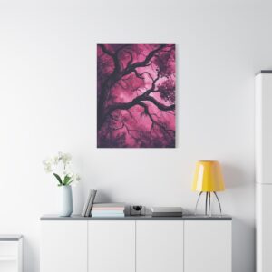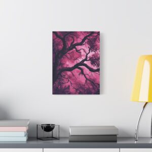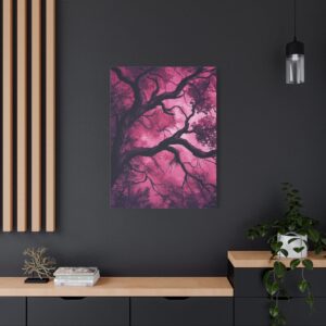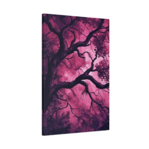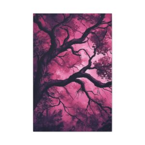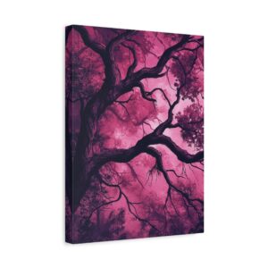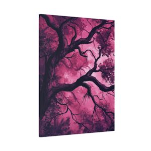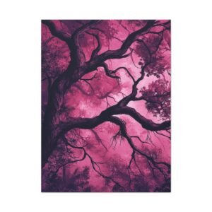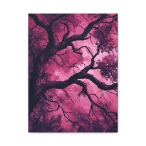 Imaginez une scène de forêt tordue baignée dans une atmosphère inquiétante. Des silhouettes spectrales se cachent dans l’ombre, tandis que des branches d’arbres déformées s’étendent comme des doigts noueux. La palette de couleurs, mêlant des tons profonds de pourpre et de rouge sombre, accentue l’ambiance mystérieuse et envoûtante.