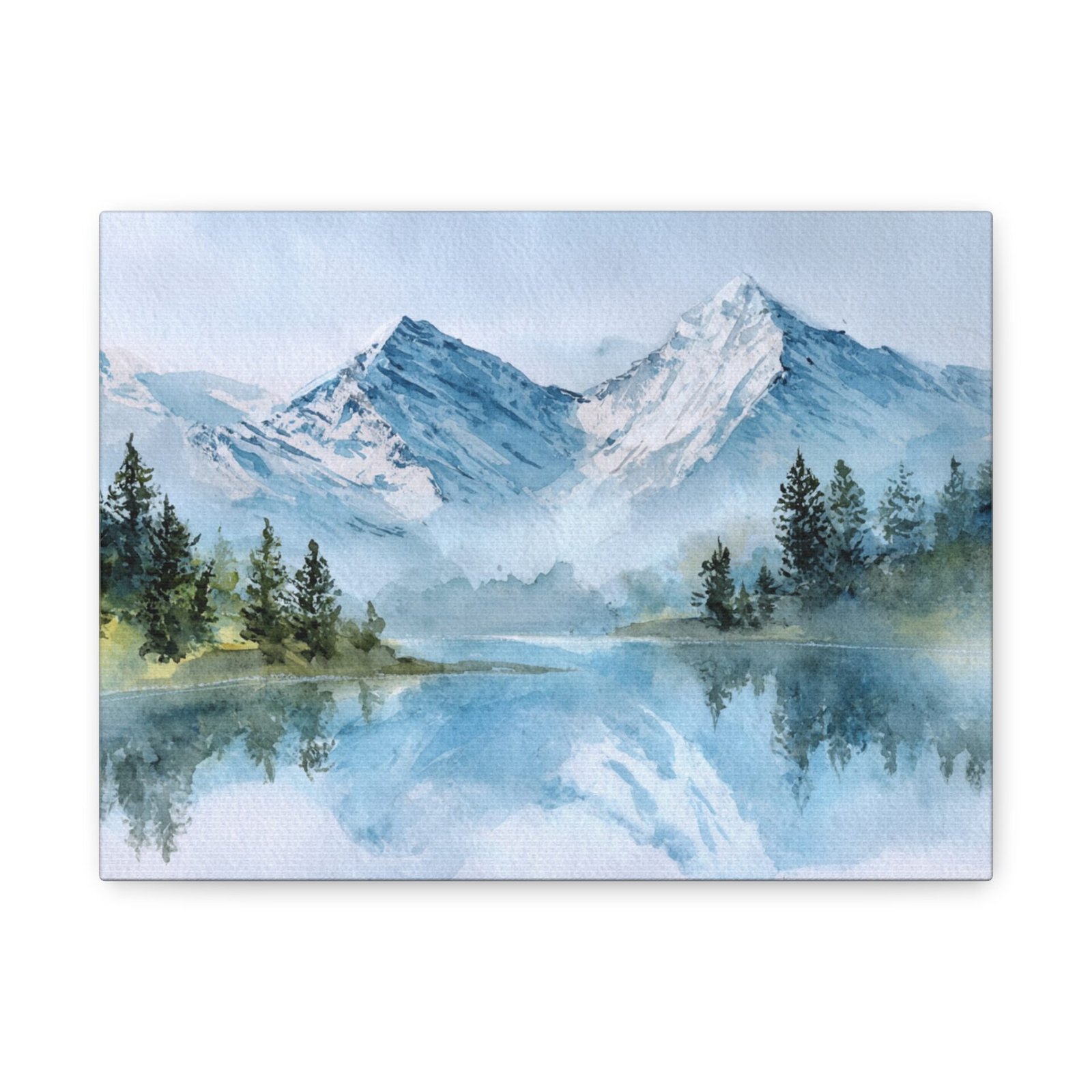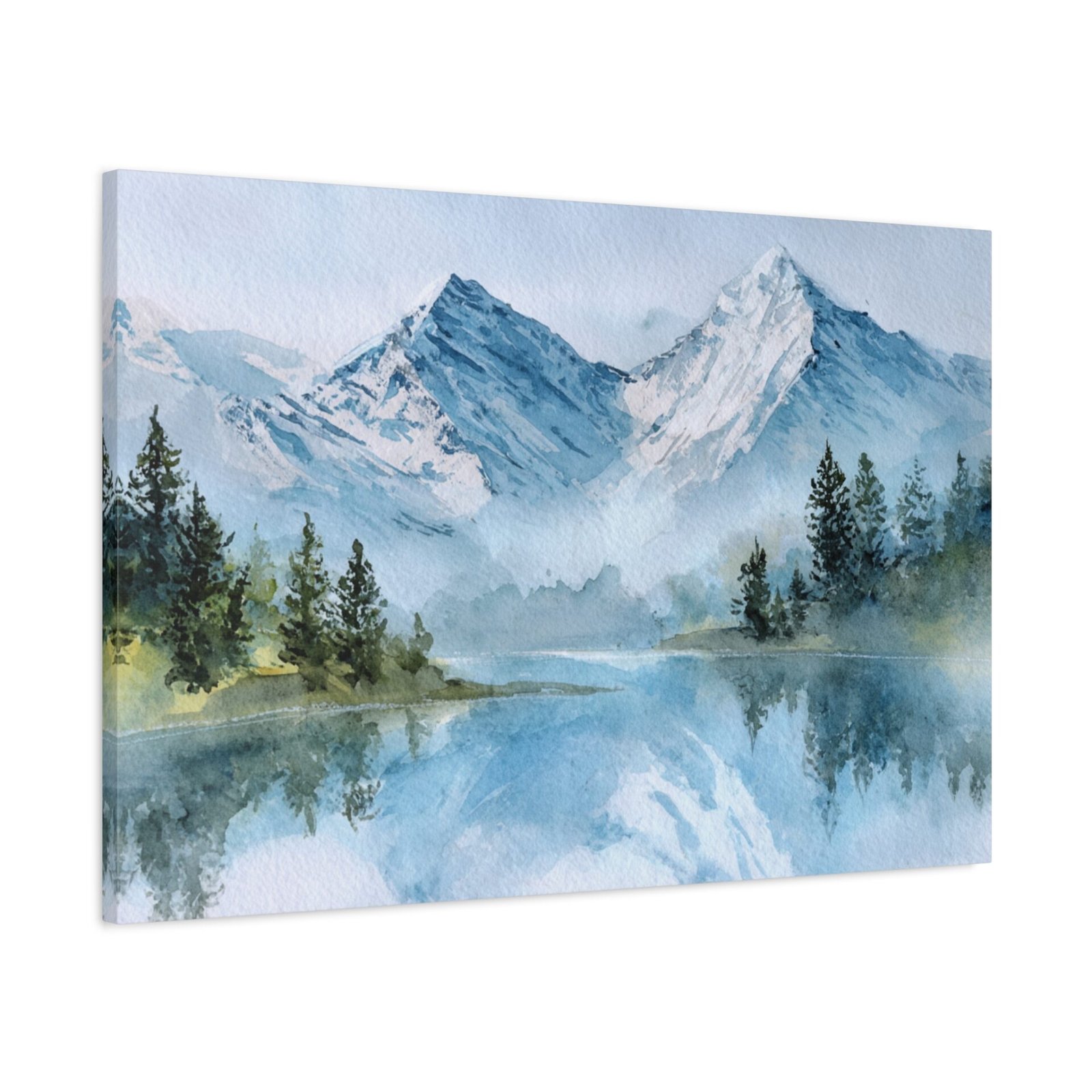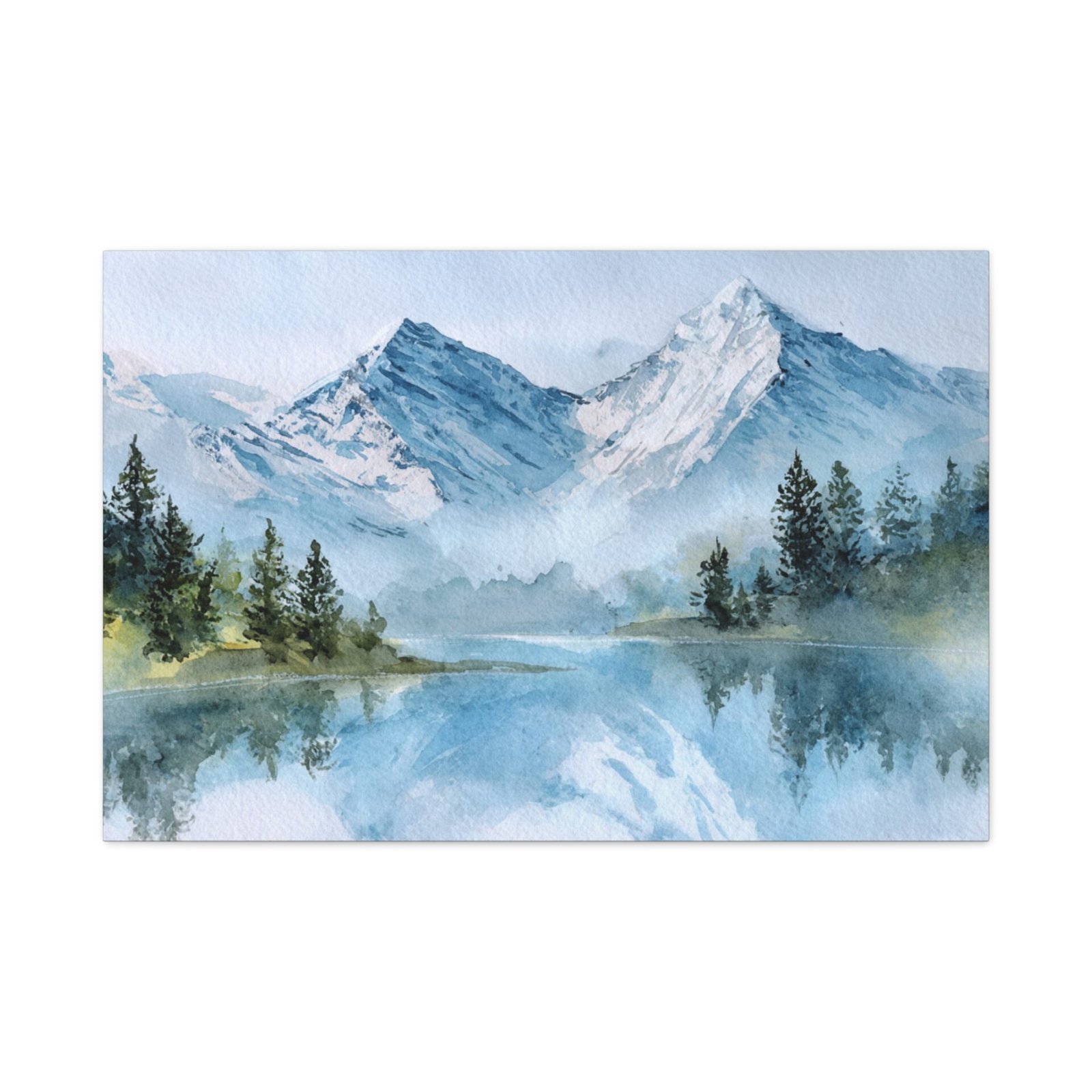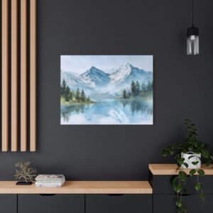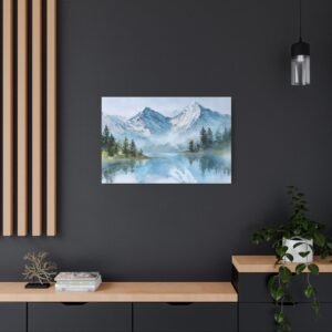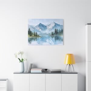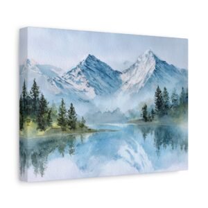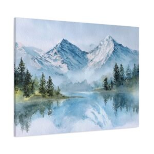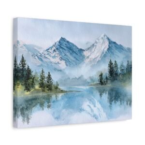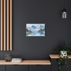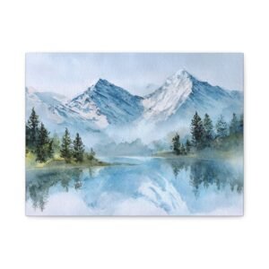 Découvrez la beauté des Alpes avec ce Tableau Aquarelle Alpes. Il présente un paysage montagnard alpin en style aquarelle, avec des sommets enneigés qui se dressent majestueusement. Le lac de montagne d’une clarté cristalline reflète ces sommets, tandis que des forêts de pins se trouvent au premier plan. Les tons doux de bleu et de blanc, agrémentés de délicates touches de vert, créent une atmosphère paisible. Les délicats lavis d’aquarelle et les couches transparentes donnent vie à ce paysage avec des effets de pigments fluides.