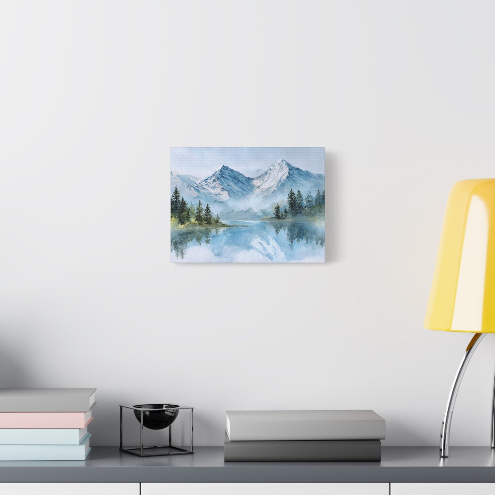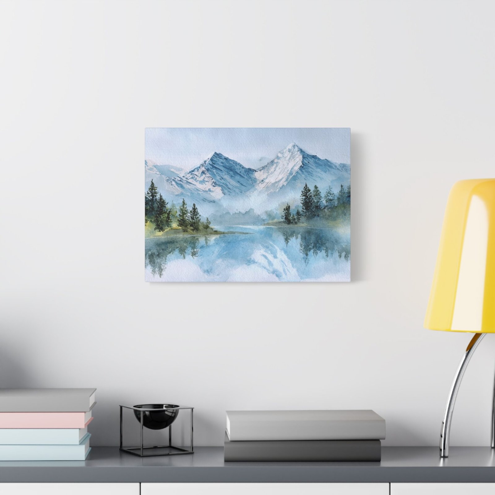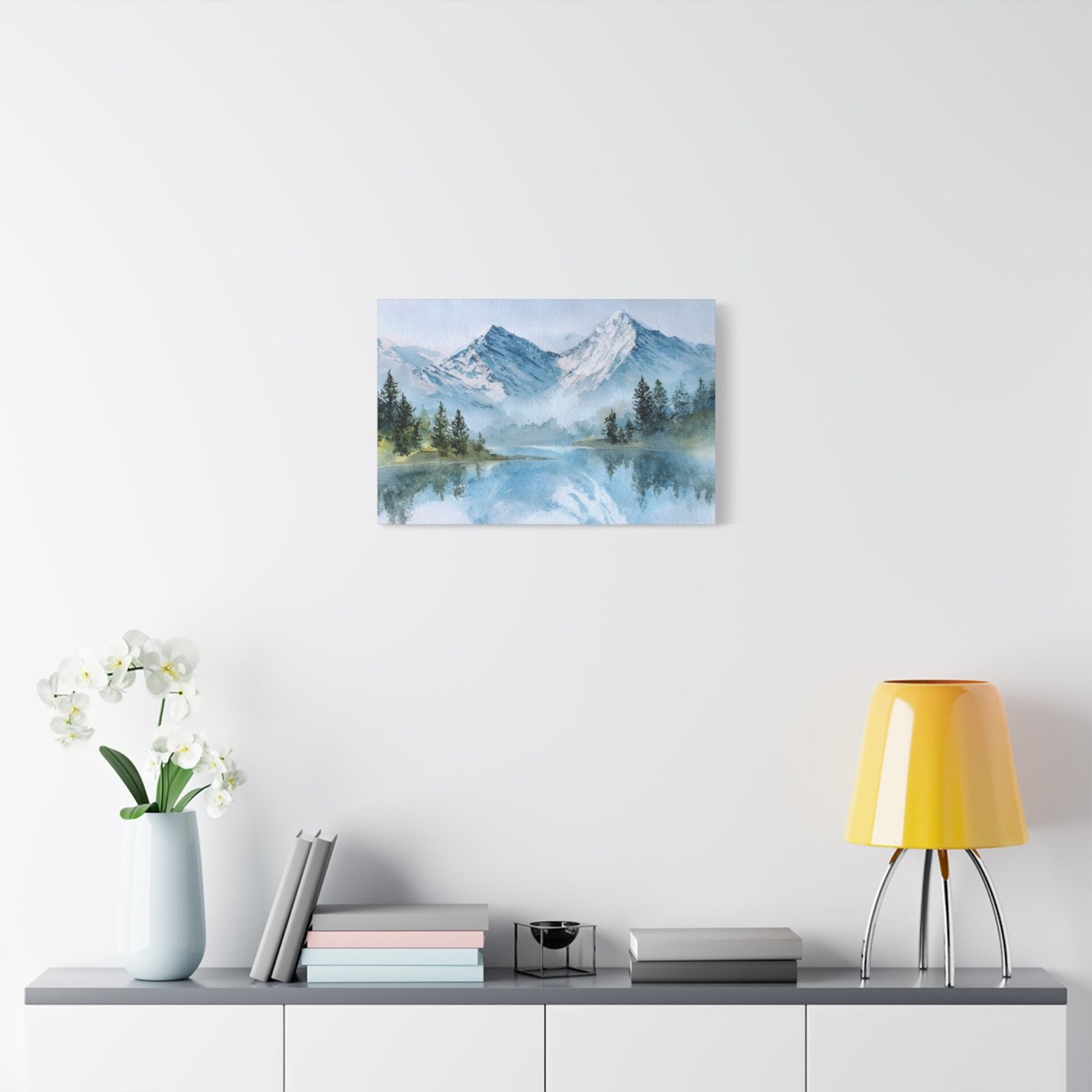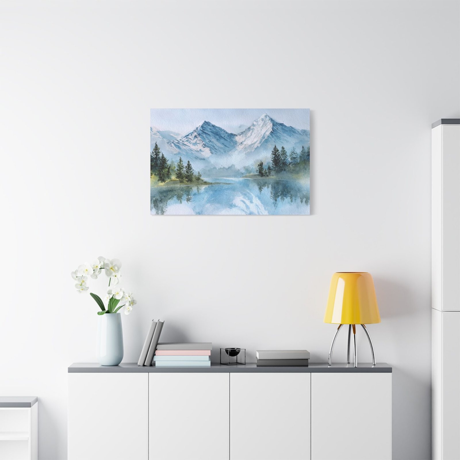 Découvrez la beauté des Alpes avec ce Tableau Aquarelle Alpes. Il présente un paysage montagnard alpin en style aquarelle, avec des sommets enneigés qui se dressent majestueusement. Le lac de montagne d’une clarté cristalline reflète ces sommets, tandis que des forêts de pins se trouvent au premier plan. Les tons doux de bleu et de blanc, agrémentés de délicates touches de vert, créent une atmosphère paisible. Les délicats lavis d’aquarelle et les couches transparentes donnent vie à ce paysage avec des effets de pigments fluides.