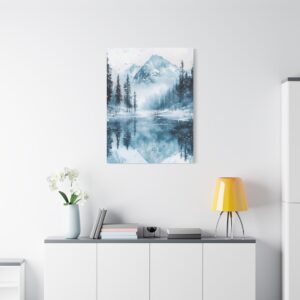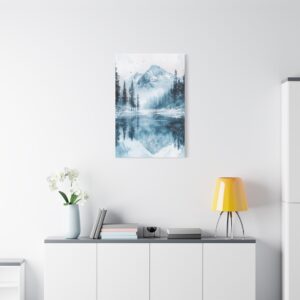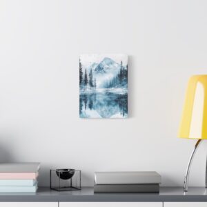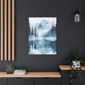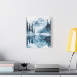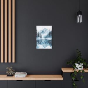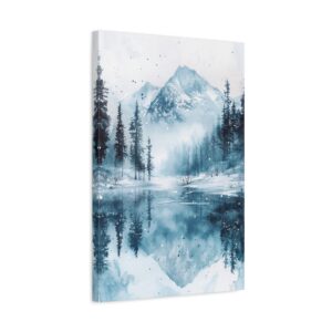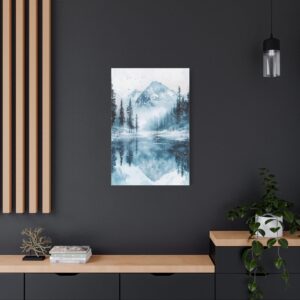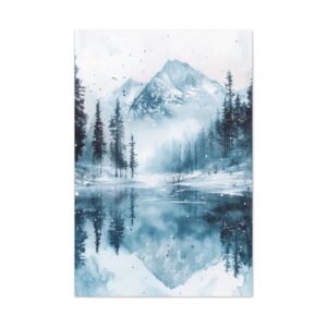 Plongez dans l’atmosphère féérique de ce paysage hivernal où montagnes enneigées et pins majestueux se reflètent dans un lac gelé. Les délicates touches d’aquarelle créent une ambiance éthérée, tandis que les éclaboussures de peinture évoquent subtilement la chute des flocons.