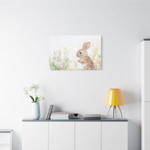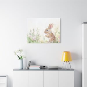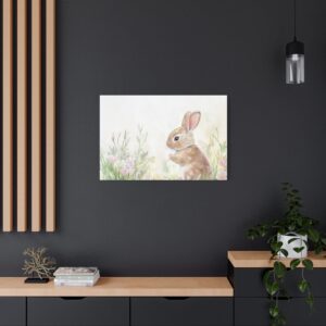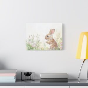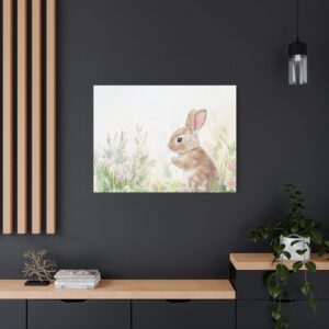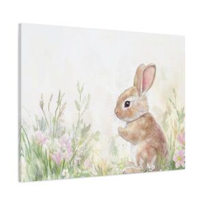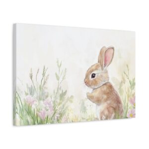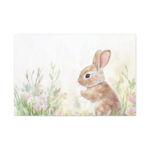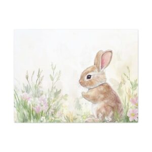Craquez pour ce lapin aquarelle adorable, peint dans des tons pastels délicats qui évoquent toute la tendresse de l’enfance. Son expression espiègle et sa queue cotonneuse, entourées de fleurs printanières, créent une ambiance féerique parfaite pour l’univers des tout-petits.