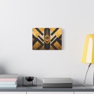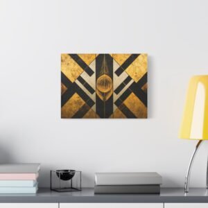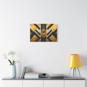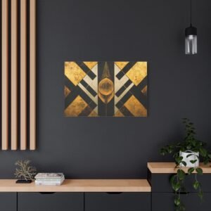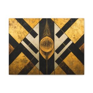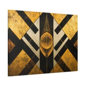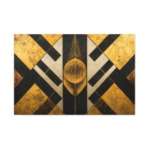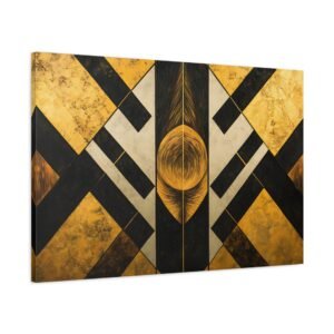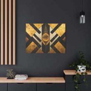 Laissez-vous séduire par ce tableau contemporain qui réinvente les codes Art Déco avec audace. Les motifs géométriques saisissants en noir et or créent une composition symétrique sophistiquée, parfaite pour insuffler une touche de glamour moderne à votre intérieur.