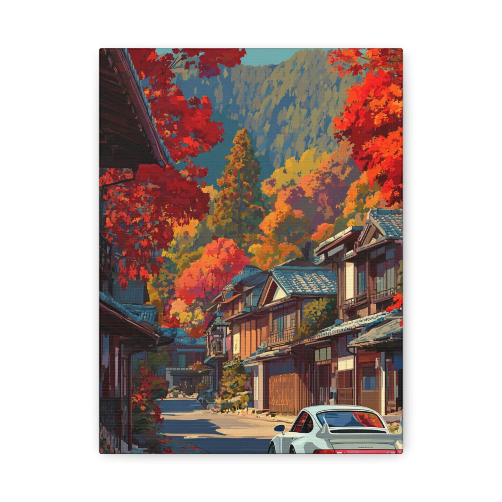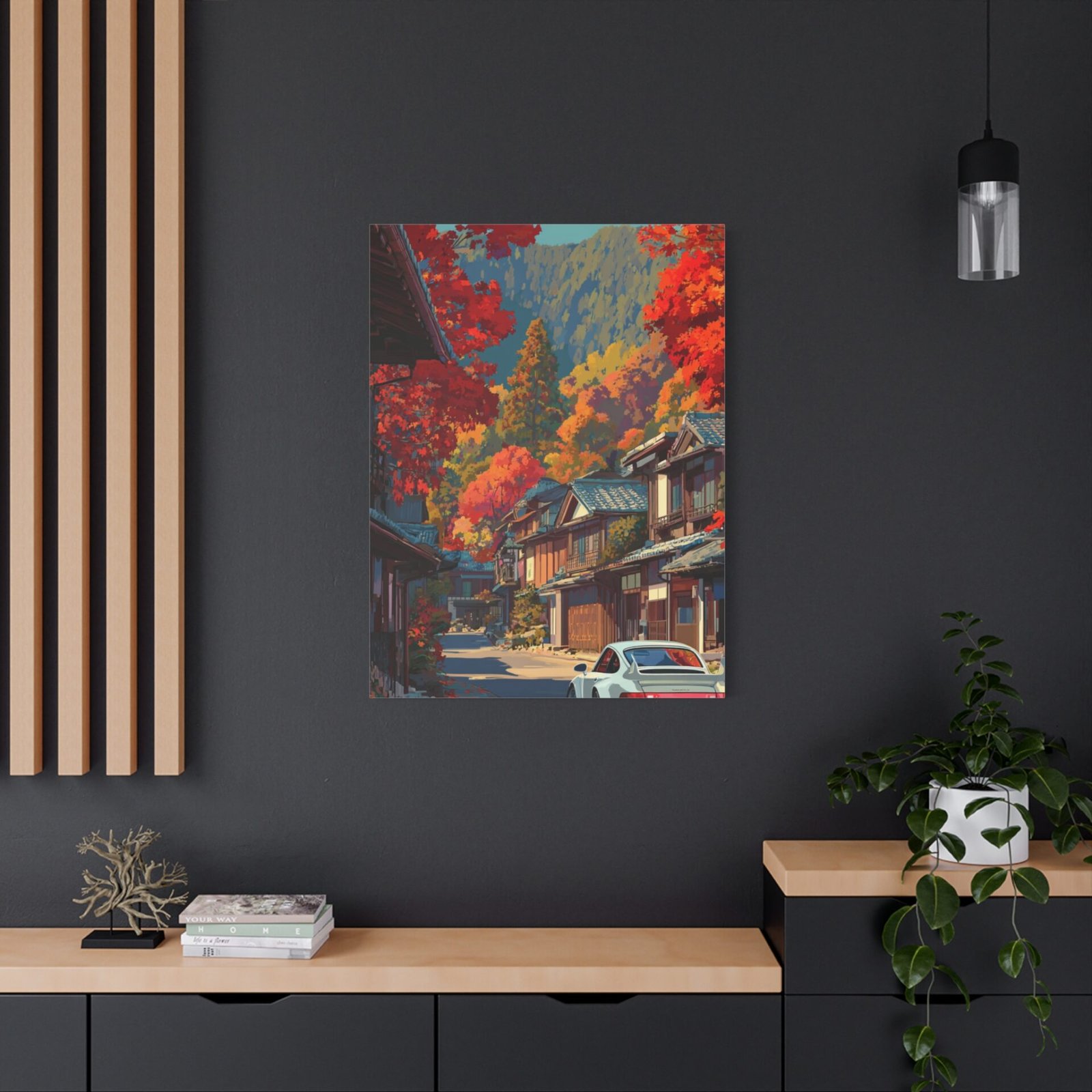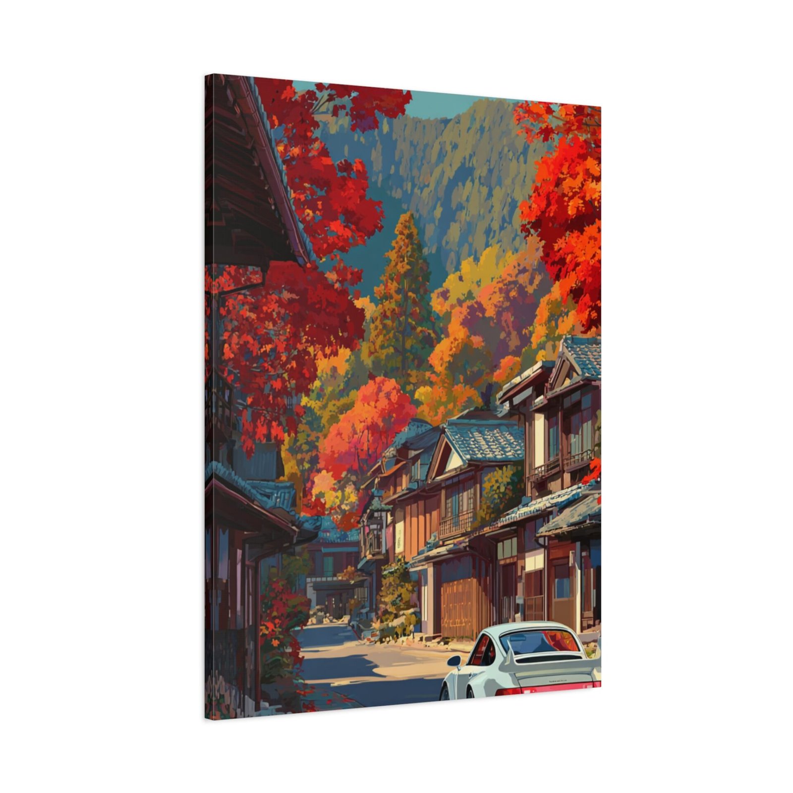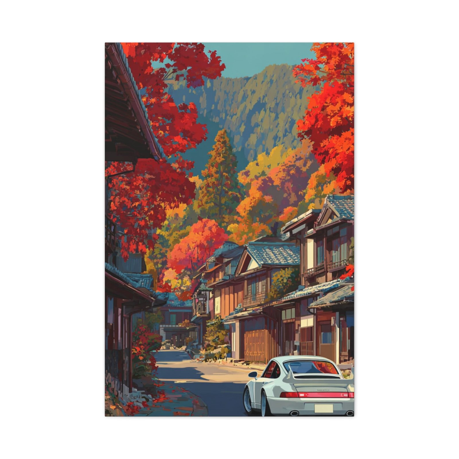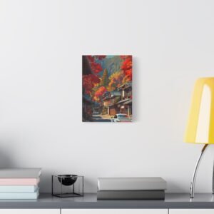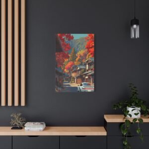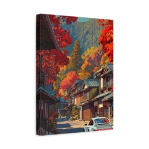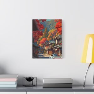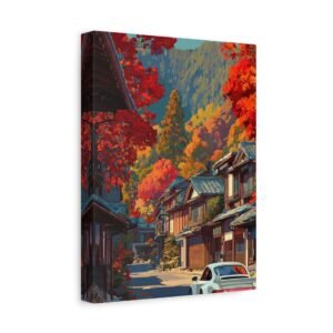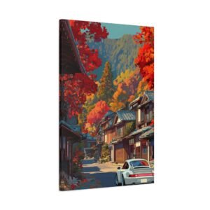 Plongez dans la beauté de l’automne japonais avec ce tableau d’une scène rurale pittoresque. Une voiture de sport blanche sillonne une rue de village traditionnel japonais, bordée de bâtiments historiques en bois aux toits de tuiles courbés. Les érables rouges d’automne ajoutent une touche de couleur éclatante, tandis que les feuilles rouges tombées sur la route d’asphalte ajoutent une touche de romantisme. L’architecture traditionnelle se mêle à des éléments modernes, créant une ambiance unique. Le tableau est réalisé dans un style d’art anime, avec un éclairage chaleureux d’après-midi et une composition cinématographique.