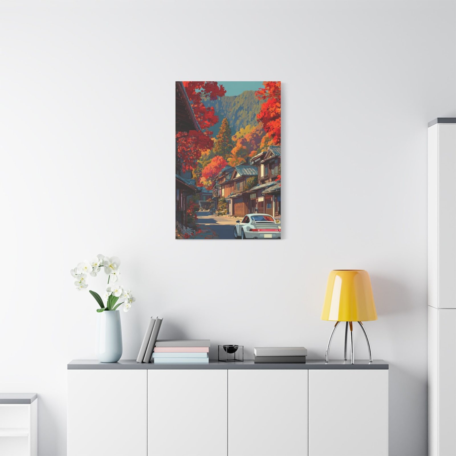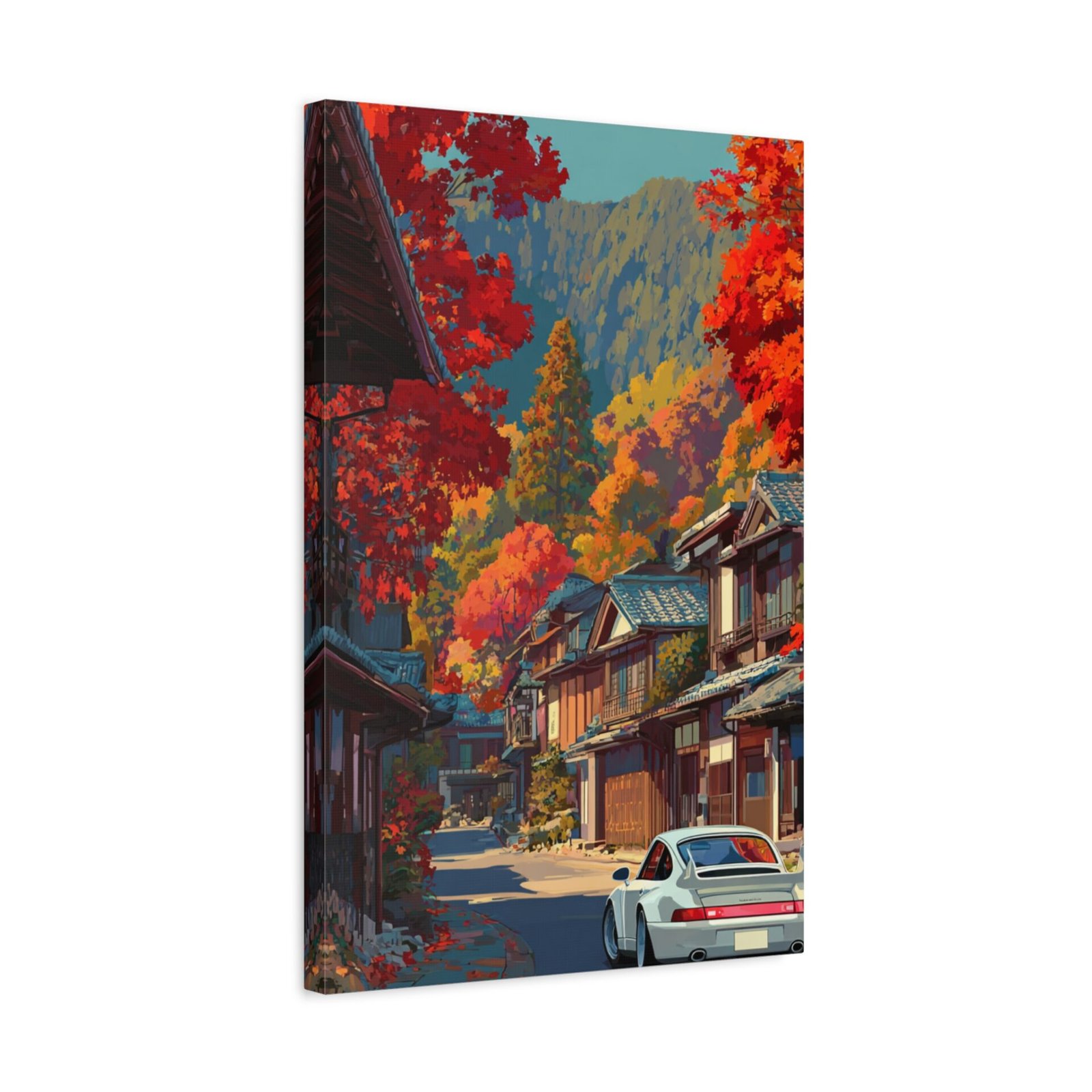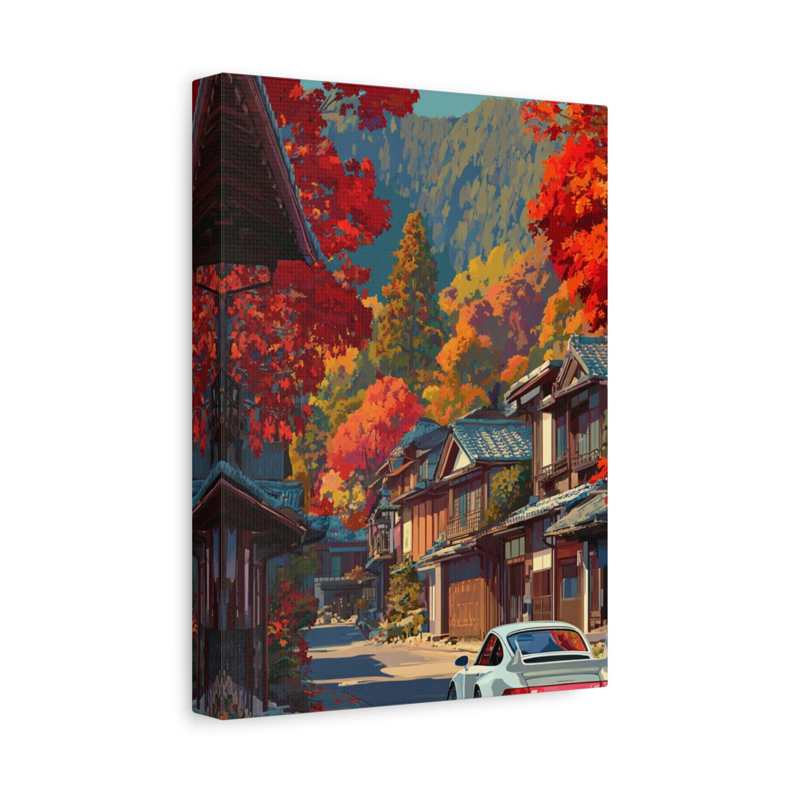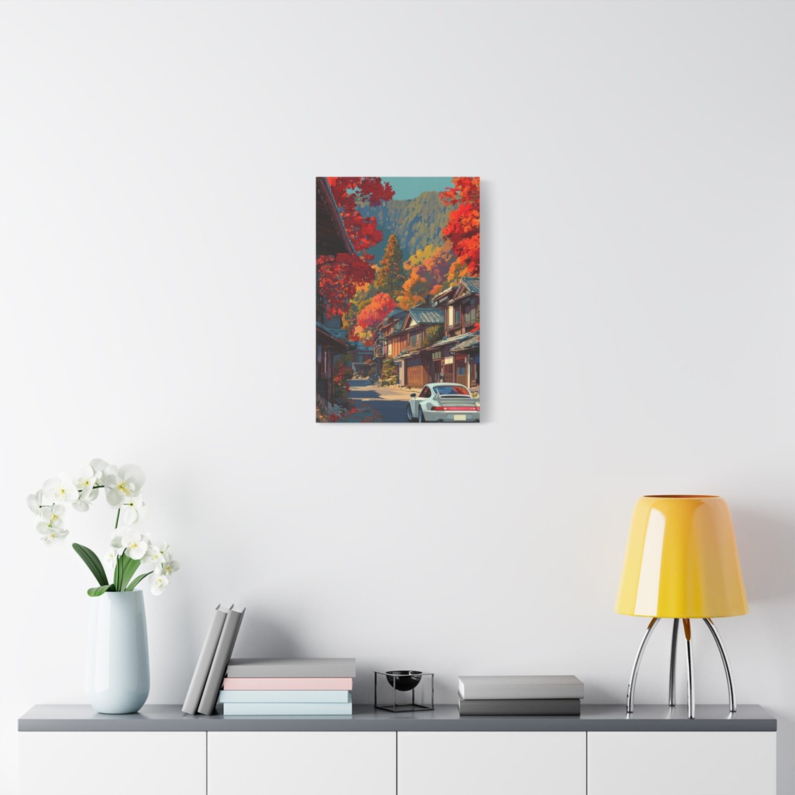 Plongez dans la beauté de l’automne japonais avec ce tableau d’une scène rurale pittoresque. Une voiture de sport blanche sillonne une rue de village traditionnel japonais, bordée de bâtiments historiques en bois aux toits de tuiles courbés. Les érables rouges d’automne ajoutent une touche de couleur éclatante, tandis que les feuilles rouges tombées sur la route d’asphalte ajoutent une touche de romantisme. L’architecture traditionnelle se mêle à des éléments modernes, créant une ambiance unique. Le tableau est réalisé dans un style d’art anime, avec un éclairage chaleureux d’après-midi et une composition cinématographique.