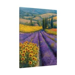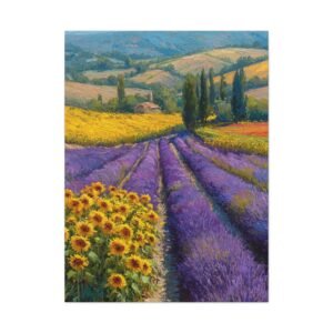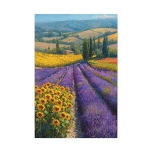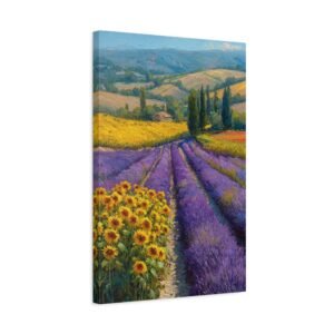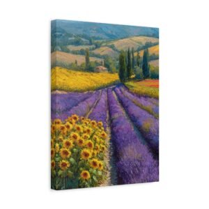 Découvrez notre magnifique tableau avec Lavande & Tournesol, une peinture à l’huile qui capture l’essence de la campagne provençale. Les champs de lavande pourpre s’étendent à côté des taches dorées de tournesols, créant un rythme visuel grâce à des couleurs contrastées. L’artiste a su capturer la lumière estivale chaude qui projette de longues ombres sur le paysage vallonné. La riche palette de couleurs, mêlant le pourpre, le jaune et le vert, se fond naturellement dans ce paysage. Ce tableau, grâce à son style impressionniste, apportera une touche d’élégance et de douceur à votre intérieur.