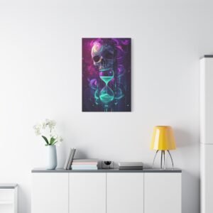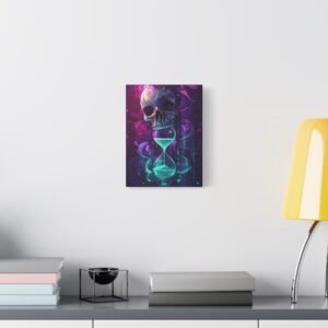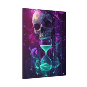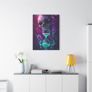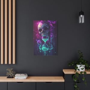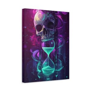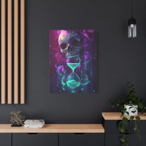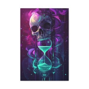 Laissez-vous envoûter par cette composition artistique mêlant symbolisme et modernité. Les lignes épurées de ce tableau digital conjuguent une tête de mort et un sablier dans une danse graphique saisissante, sublimée par des tons violets et bleu sarcelle vibrants.
