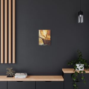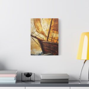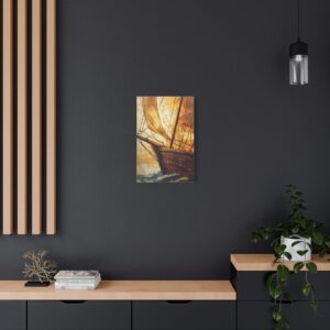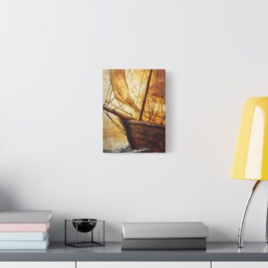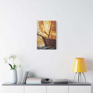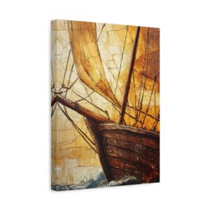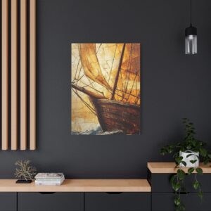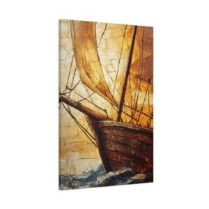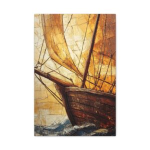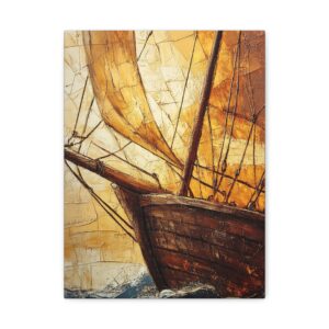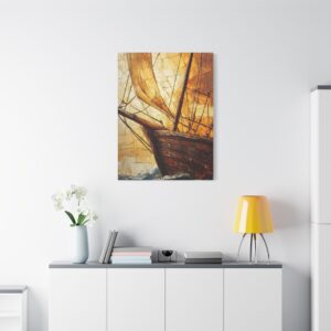 Laissez-vous transporter par cette œuvre maritime évocatrice où un majestueux voilier en bois se découpe sur un coucher de soleil spectaculaire. Les tons sépia nostalgiques et le ciel doré dramatique créent une atmosphère romantique qui évoque les grandes aventures maritimes d’antan.