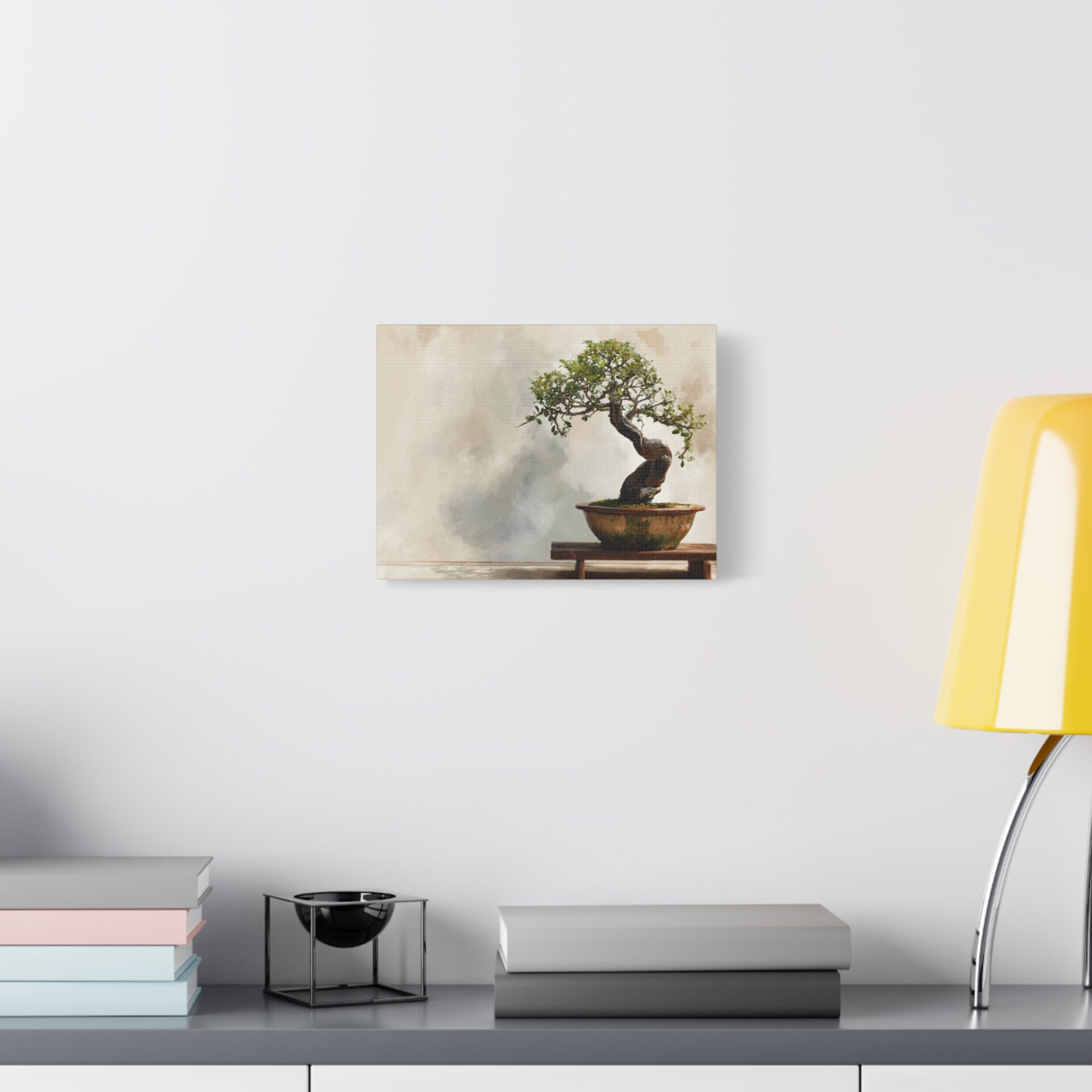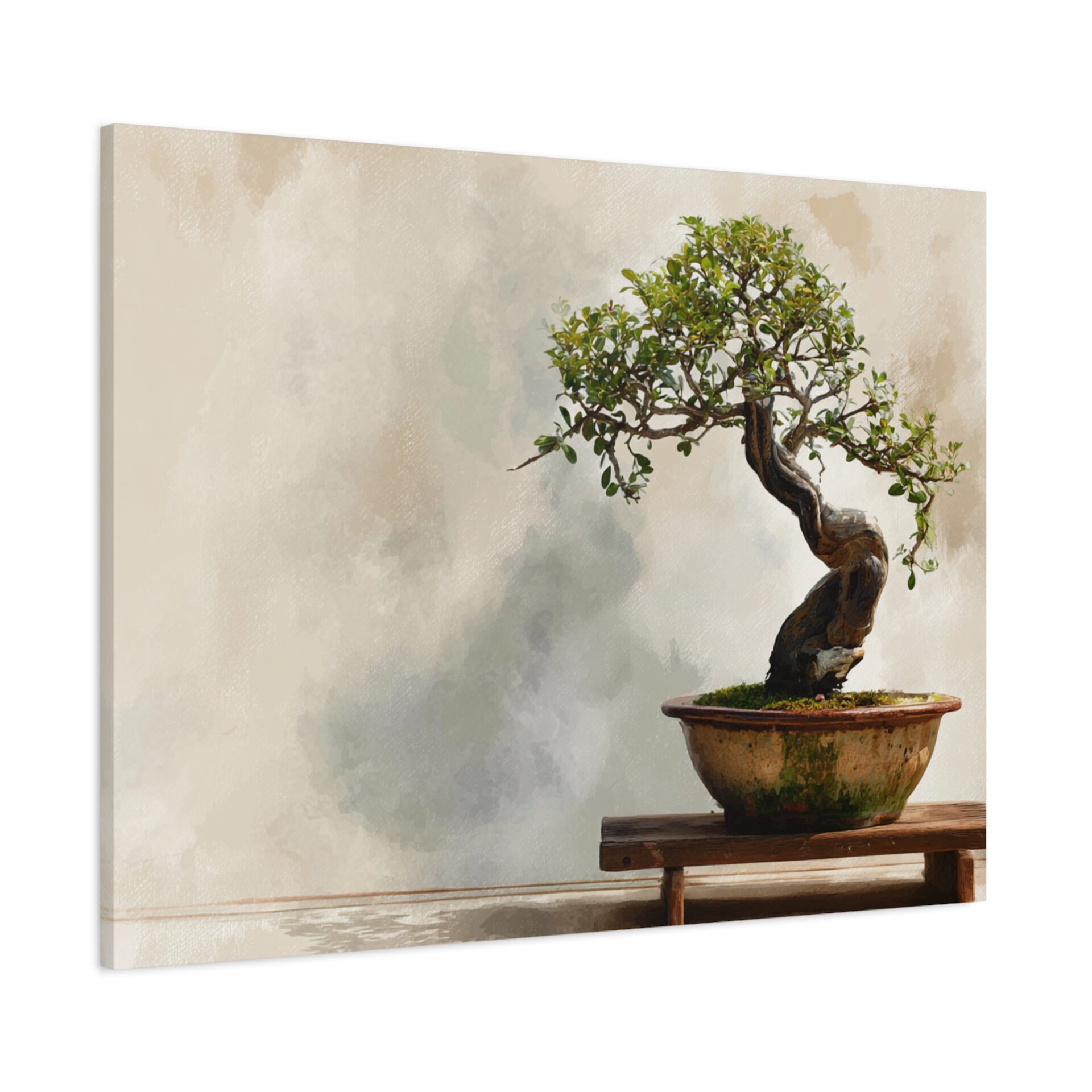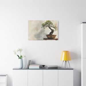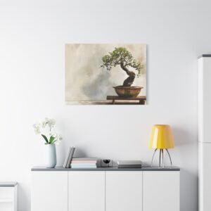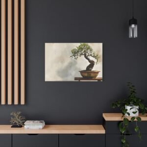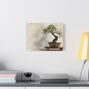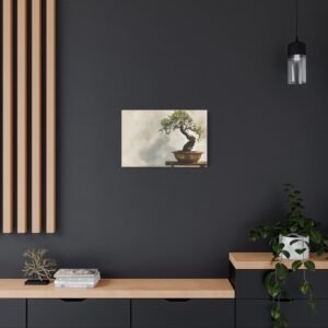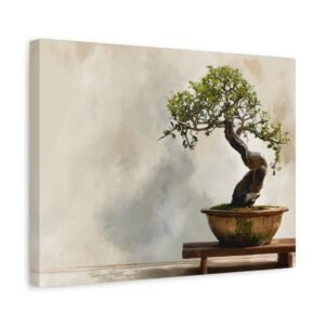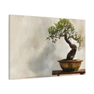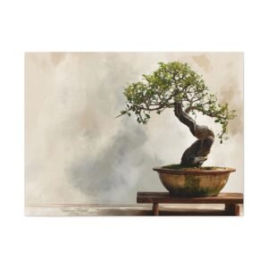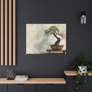Découvrez notre Tableau bonsaï traditionnel, une œuvre d’art qui allie tradition et modernité. Ce tableau représente un bonsaï japonais traditionnel, présenté sur un support en bois, avec un tronc ancien tordu et un feuillage délicat vert. Le pot en céramique aux tons terreux subtils, l’éclairage naturel doux et le fond de jardin zen serein créent une atmosphère paisible. Le style de peinture à l’aquarelle et la palette de couleurs douces renforcent l’effet apaisant de cette composition minimaliste.
