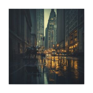 Capturez l’énergie électrisante de Wall Street au crépuscule avec cette œuvre saisissante. L’emblématique Taureau de Wall Street se dresse majestueusement sur des pavés luisants qui reflètent les lumières citadines, créant une atmosphère captivante digne des plus grands quartiers d’affaires.