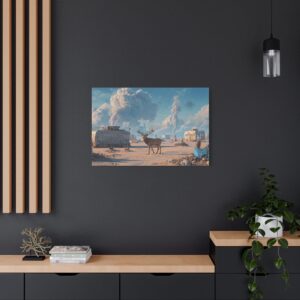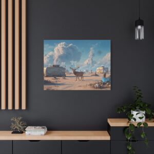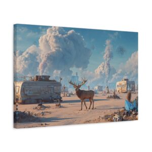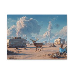 Découvrez un tableau qui défie l’ordinaire : un cerf égaré errant dans un paysage désertique surréaliste, parsemé de cristaux bleus géants émergeant du sable. Des caravanes abandonnées flottent à l’envers dans les airs, des béchers de laboratoire de la taille de cactus bouillonnent de produits chimiques arc-en-ciel, des combinaisons de protection dansent comme des épouvantails dans le vent. Des volutes de fumée mystérieuses forment des points d’interrogation dans le ciel, des masques à gaz vintage sont éparpillés comme des buissons roulants. Ce tableau Cerf & Cristaux est inspiré par l’univers de David Lynch, avec une chaleur désertique vacillante et une chimie impossible.