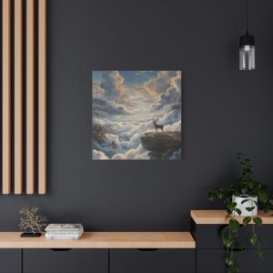 Découvrez le Tableau Cerf & Nuages Flottants, une représentation majestueuse d’un cerf royal perché sur une plateforme de nuages flottants, bien au-dessus de la terre. Cette œuvre, inspirée de la technique de peinture à l’huile de la Renaissance avec des effets de sfumato doux, est un véritable voyage visuel. Les nuages blancs et gris moelleux dérivent à différentes altitudes, tels des pierres de gué dans le ciel. Le souffle du cerf est visible dans l’air frais de la montagne, et à travers les échappées dans la couverture nuageuse, on aperçoit les vallées et les sommets lointains. La palette en bleu céleste et blanc, éclairée par une lumière dorée au coucher du soleil, apporte une touche de sérénité à votre intérieur.