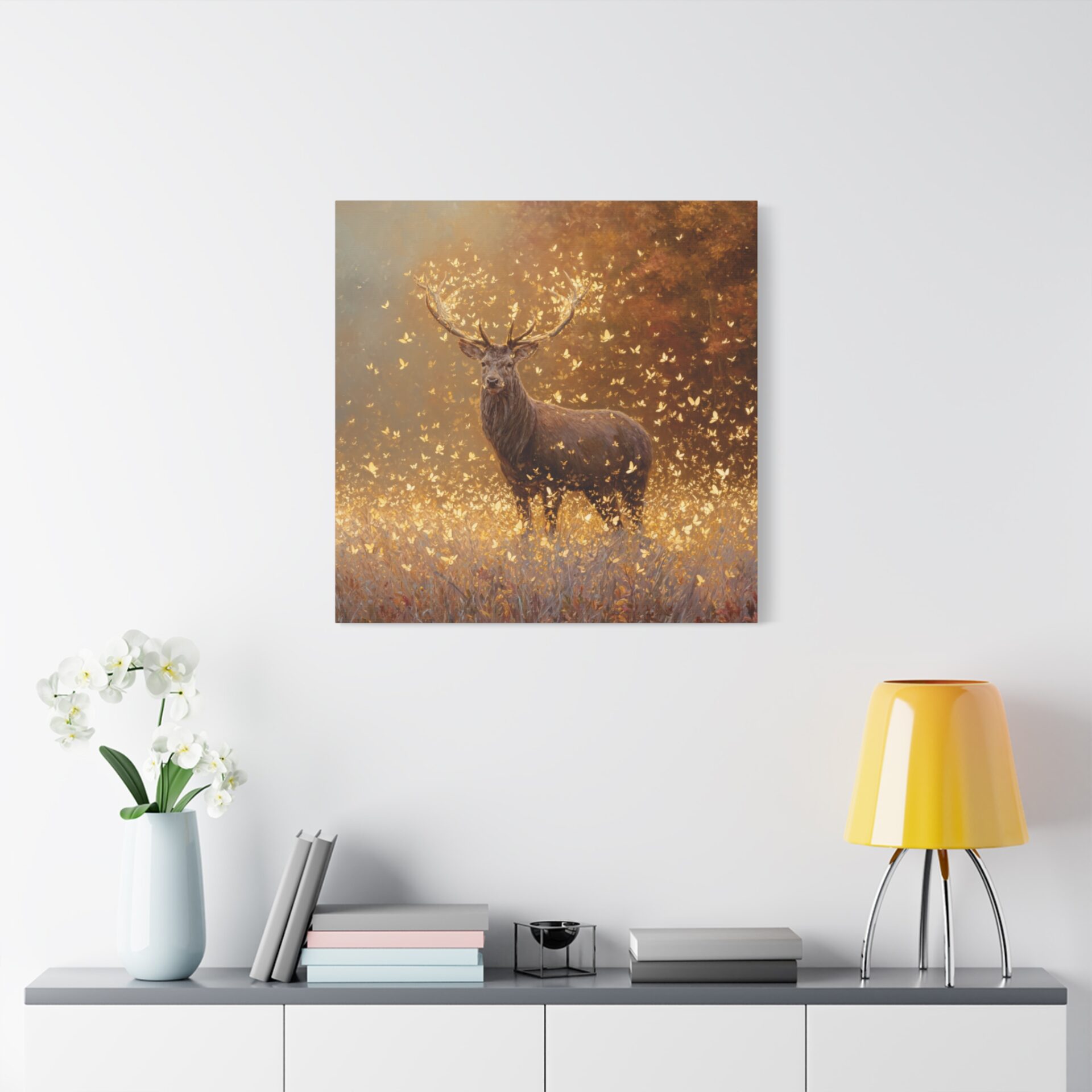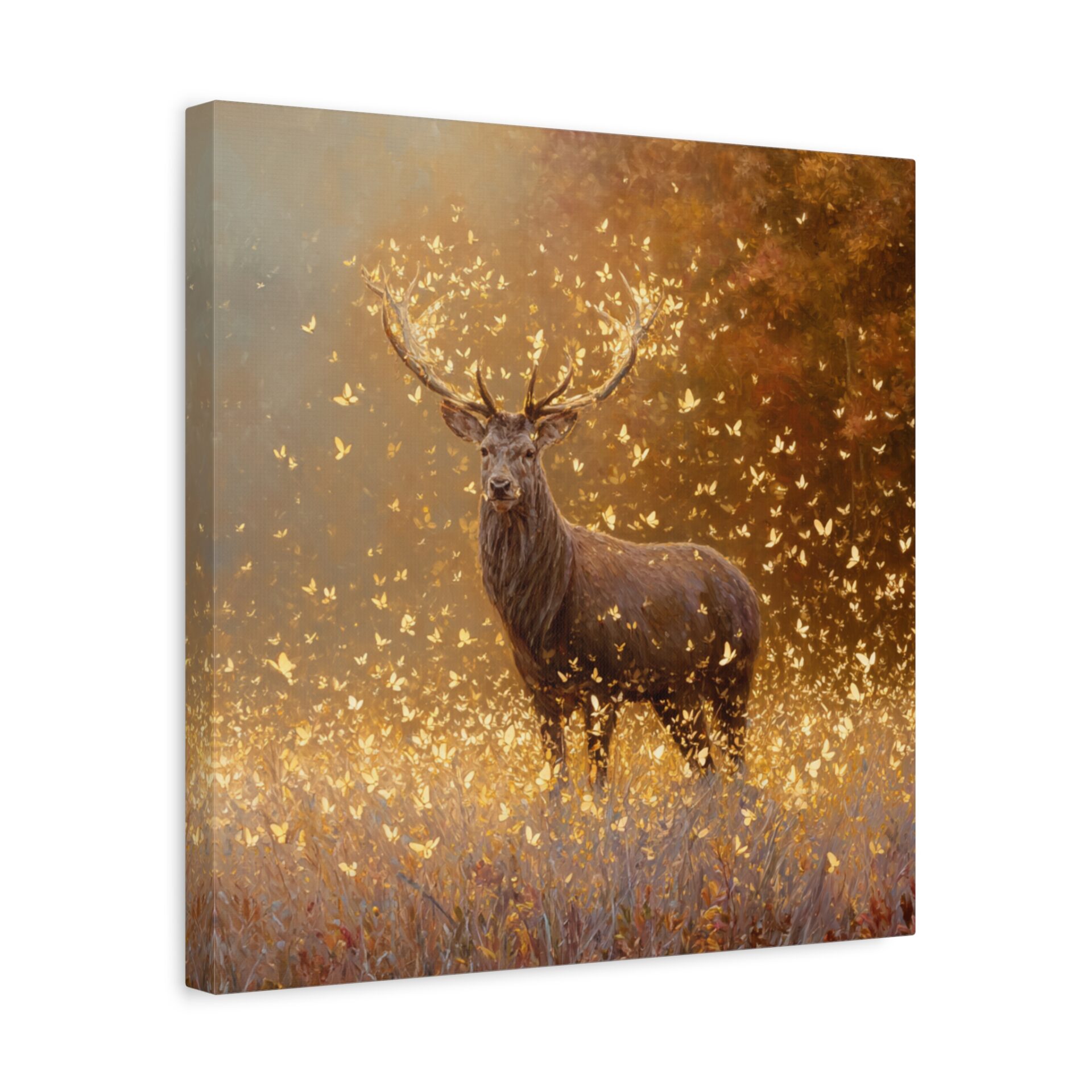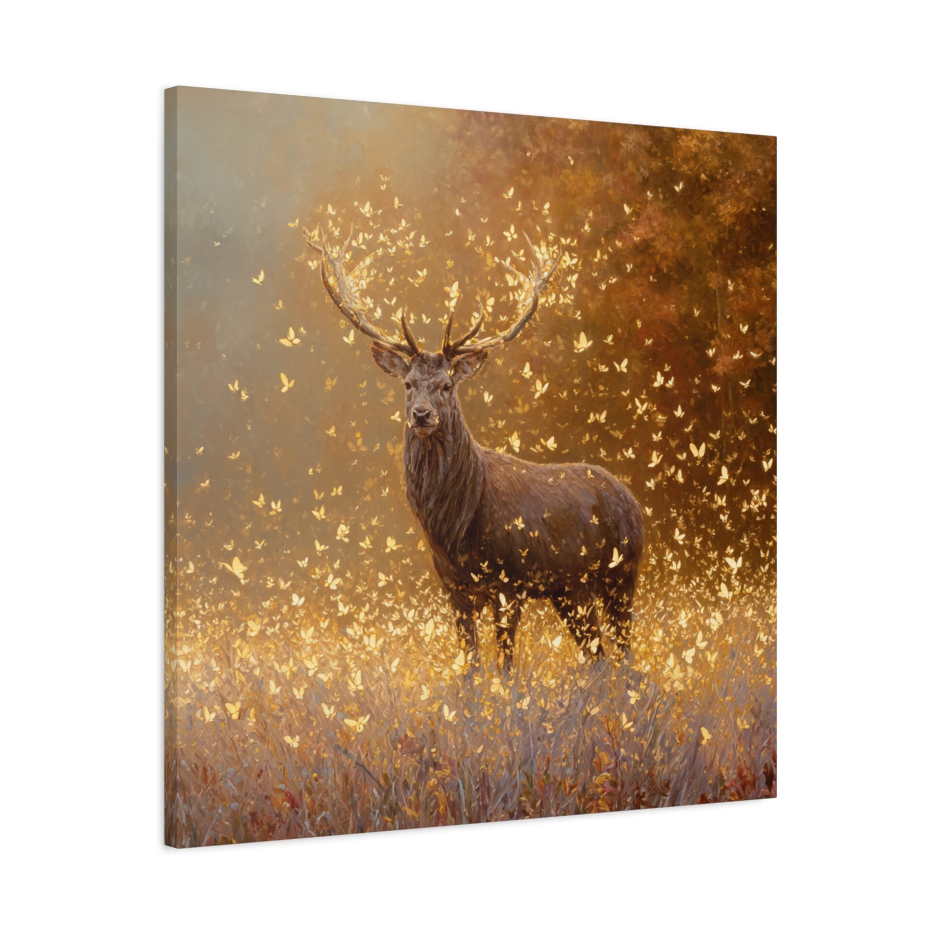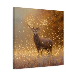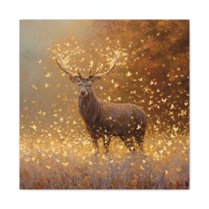 Découvrez notre Tableau Cerf & Papillons Dorés, une œuvre d’art qui capture la beauté d’un cerf noble debout dans une prairie dorée, entouré de centaines de papillons dorés scintillants. Le tableau, peint dans un style d’huile romantique classique, offre une atmosphère éthérée et enchanteuse, avec une lumière de coucher de soleil chaude qui filtre à travers la scène, créant une lueur magique. Les ailes délicates des papillons captent et reflètent l’illumination de l’heure dorée, ajoutant une touche de magie à votre espace de vie.