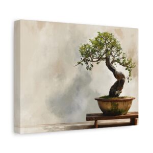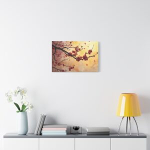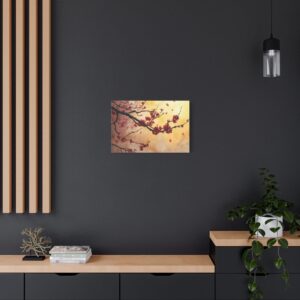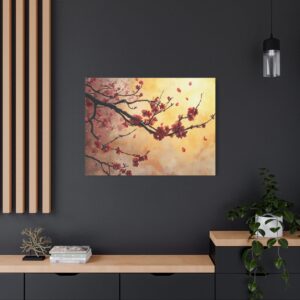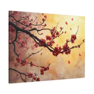 Les branches gracieuses se déploient avec dramaturgie sur la toile, tandis que les tons profonds de bourgogne créent une atmosphère enveloppante. La chute des pétales, capturée avec finesse, insuffle un mouvement perpétuel à cette scène de jardin zen contemporain.