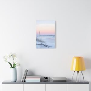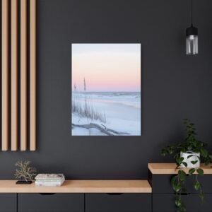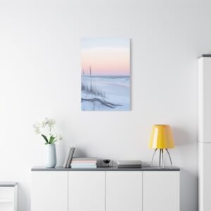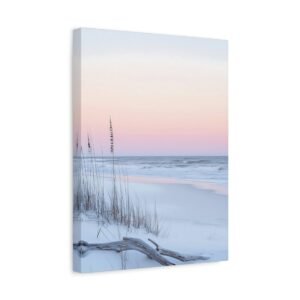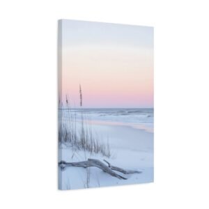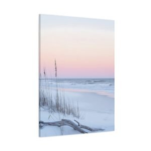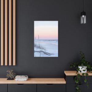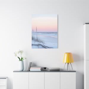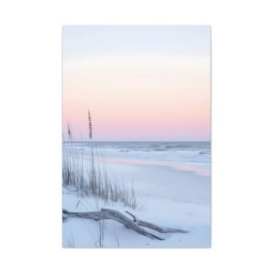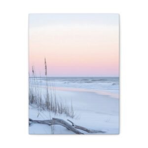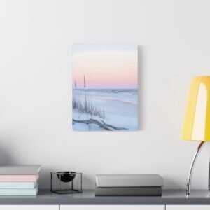 L’horizon lointain se pare de teintes rose et lavande, tandis que les herbes sauvages dansent délicatement dans la brise marine. Cette composition minimaliste aux tons doux apporte une touche d’évasion et de quiétude à votre espace de repos.
