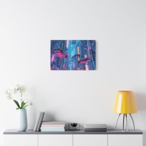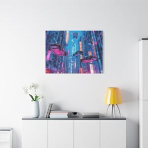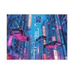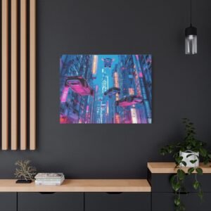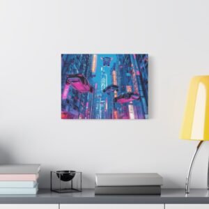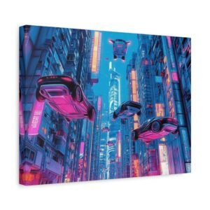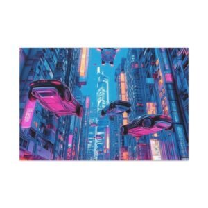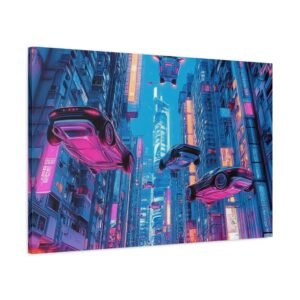 Transformez la chambre de votre ado en un sanctuaire high-tech avec ce tableau saisissant. L’illustration futuriste transporte instantanément dans une métropole du futur, où des voitures volantes sillonnent le ciel entre des gratte-ciels illuminés de néons. Les couleurs vibrantes et le style digital art créent une ambiance électrisante, parfaite pour stimuler l’imagination d’un adolescent.