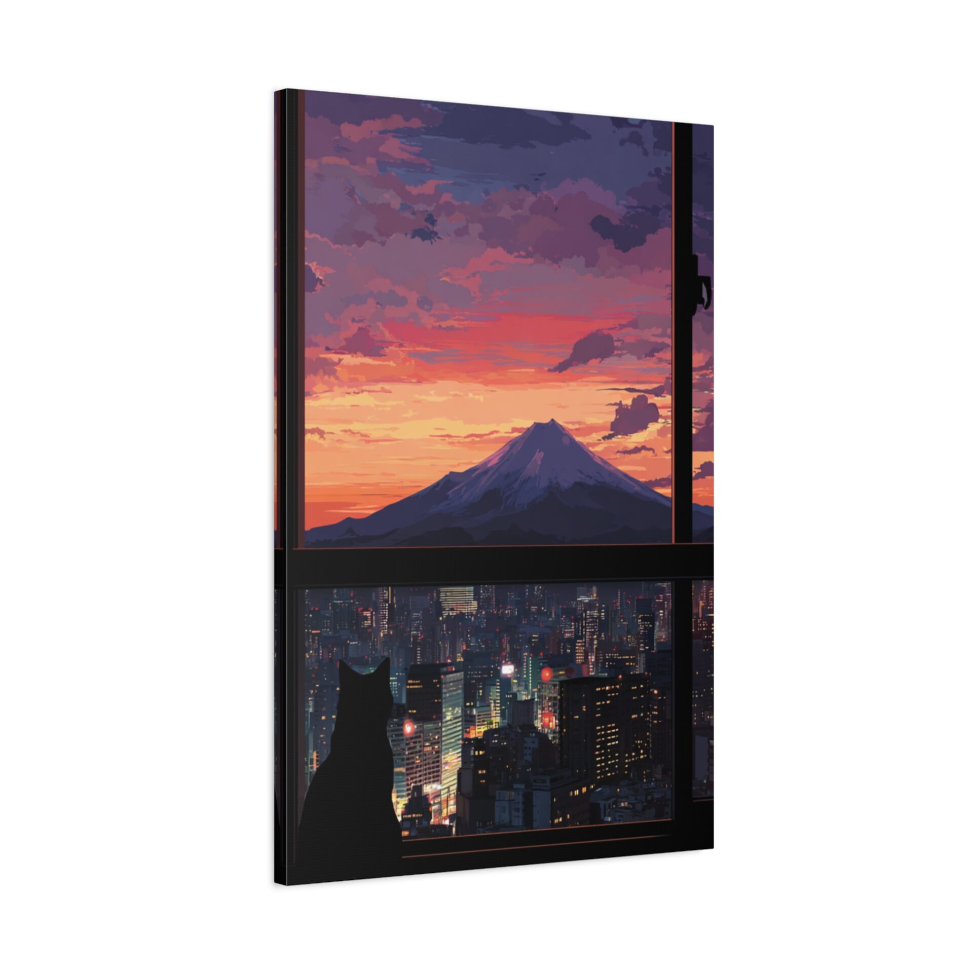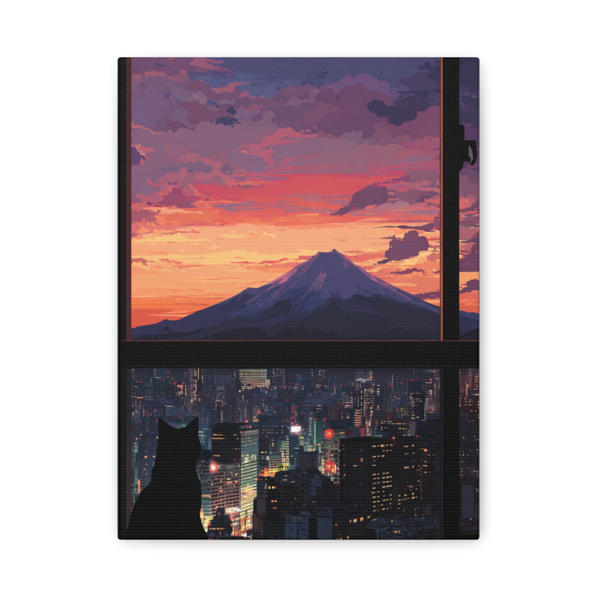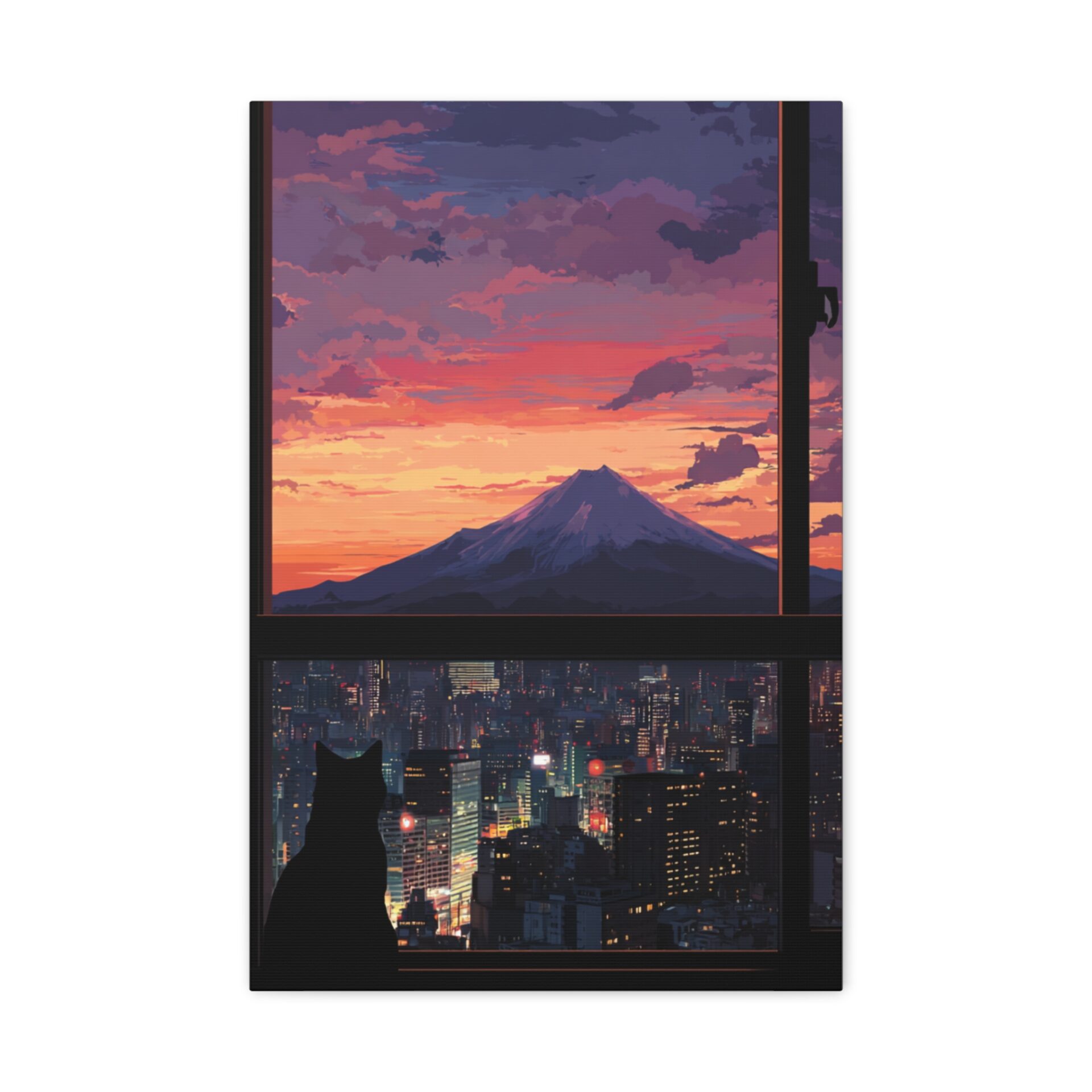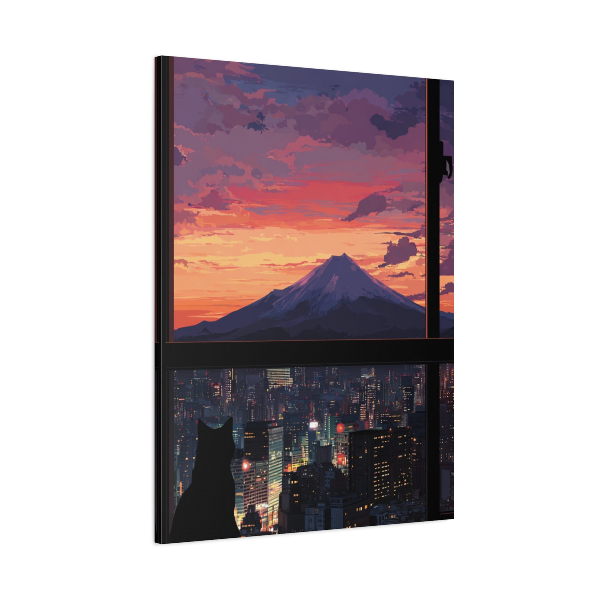 Plongez dans l’ambiance urbaine et chaleureuse de Tokyo avec ce tableau représentant la silhouette d’un chat noir assis sur le rebord d’une fenêtre. À l’arrière-plan, vous pouvez admirer une vue panoramique de la ville avec ses bâtiments illuminés et le majestueux mont Fuji à l’horizon. Le ciel est teinté de couleurs chaudes et vives, contrastant avec la fraîcheur de la nuit tokyoïte. Cette œuvre d’art, réalisée dans un style anime, apporte une atmosphère cosy à votre intérieur.