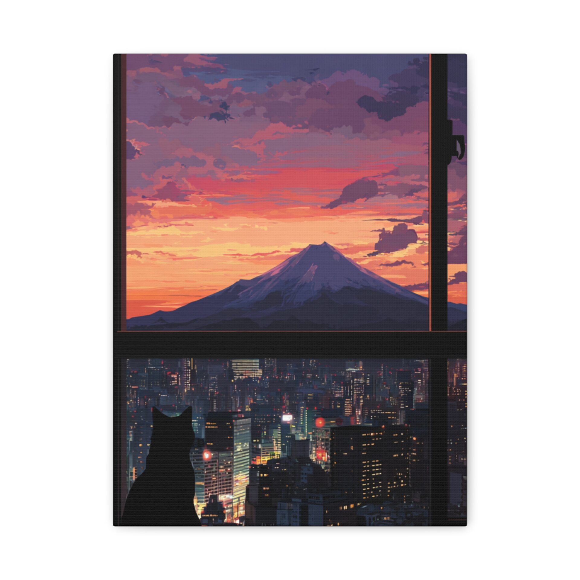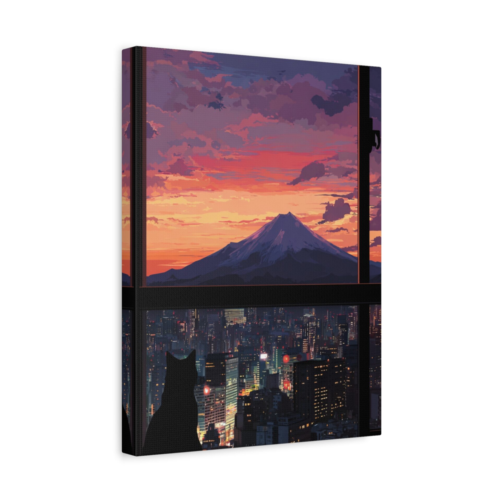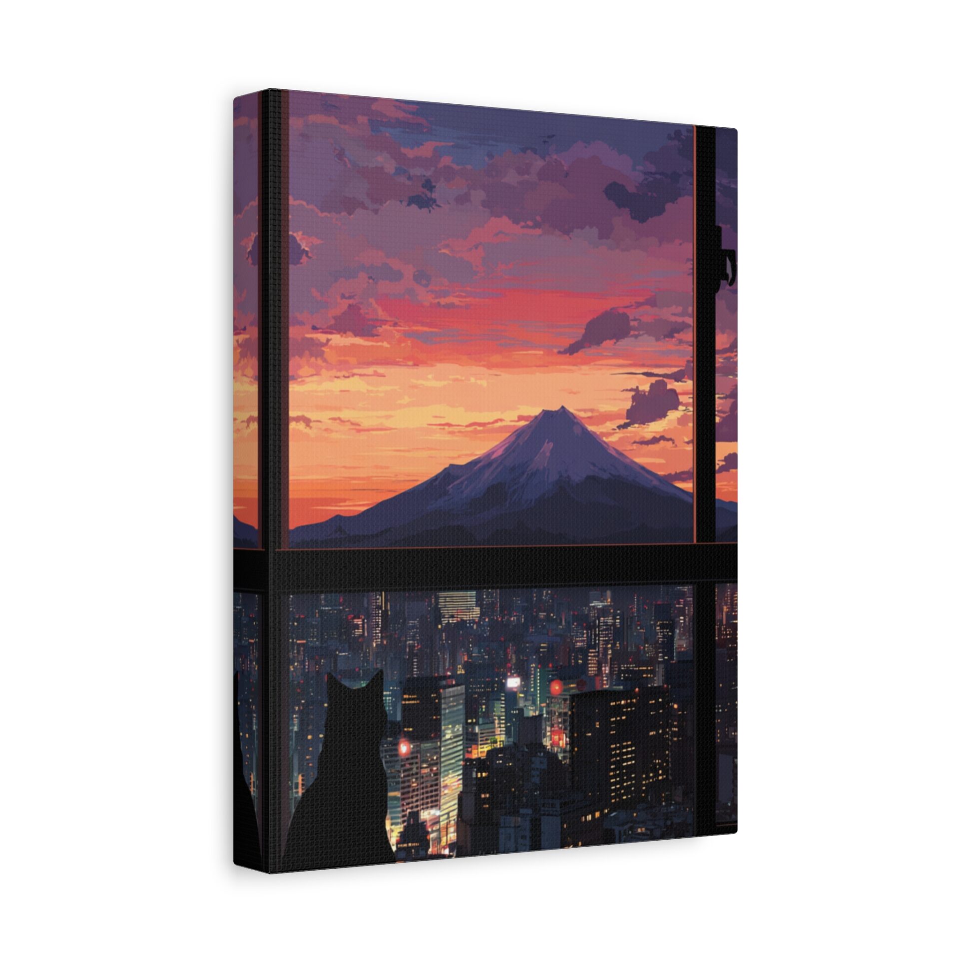 Plongez dans l’ambiance urbaine et chaleureuse de Tokyo avec ce tableau représentant la silhouette d’un chat noir assis sur le rebord d’une fenêtre. À l’arrière-plan, vous pouvez admirer une vue panoramique de la ville avec ses bâtiments illuminés et le majestueux mont Fuji à l’horizon. Le ciel est teinté de couleurs chaudes et vives, contrastant avec la fraîcheur de la nuit tokyoïte. Cette œuvre d’art, réalisée dans un style anime, apporte une atmosphère cosy à votre intérieur.