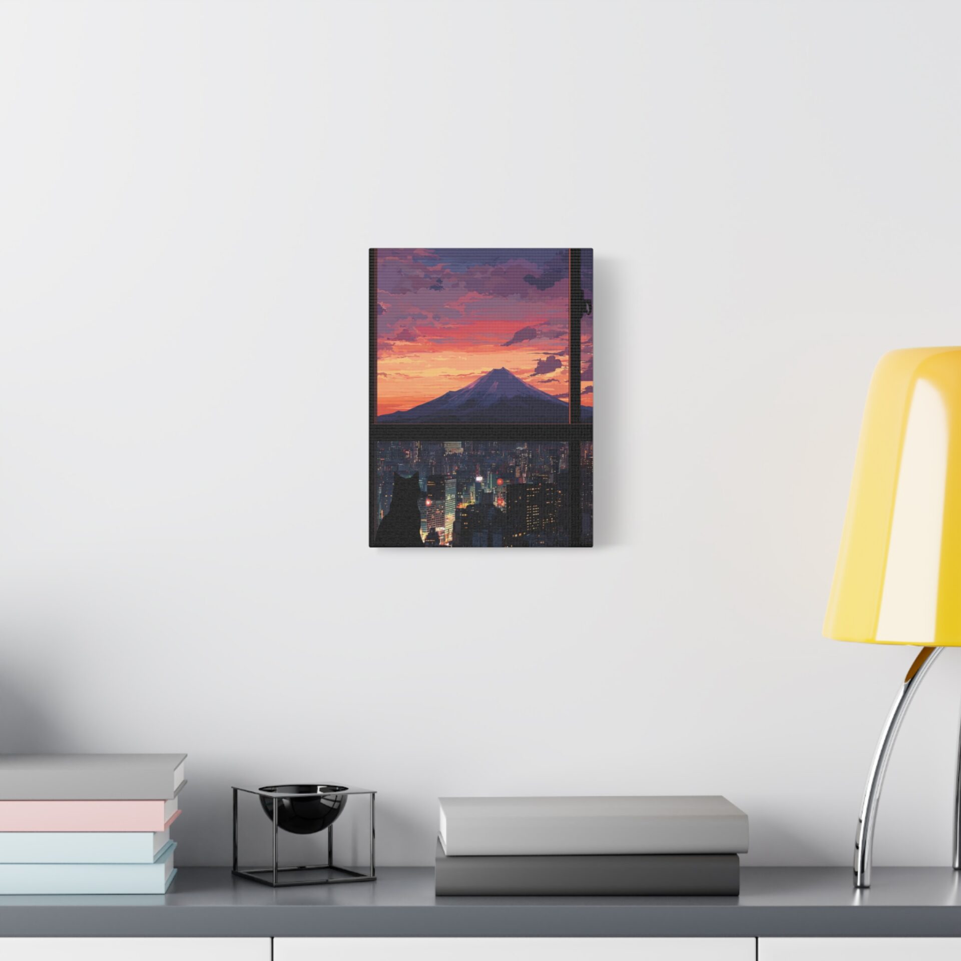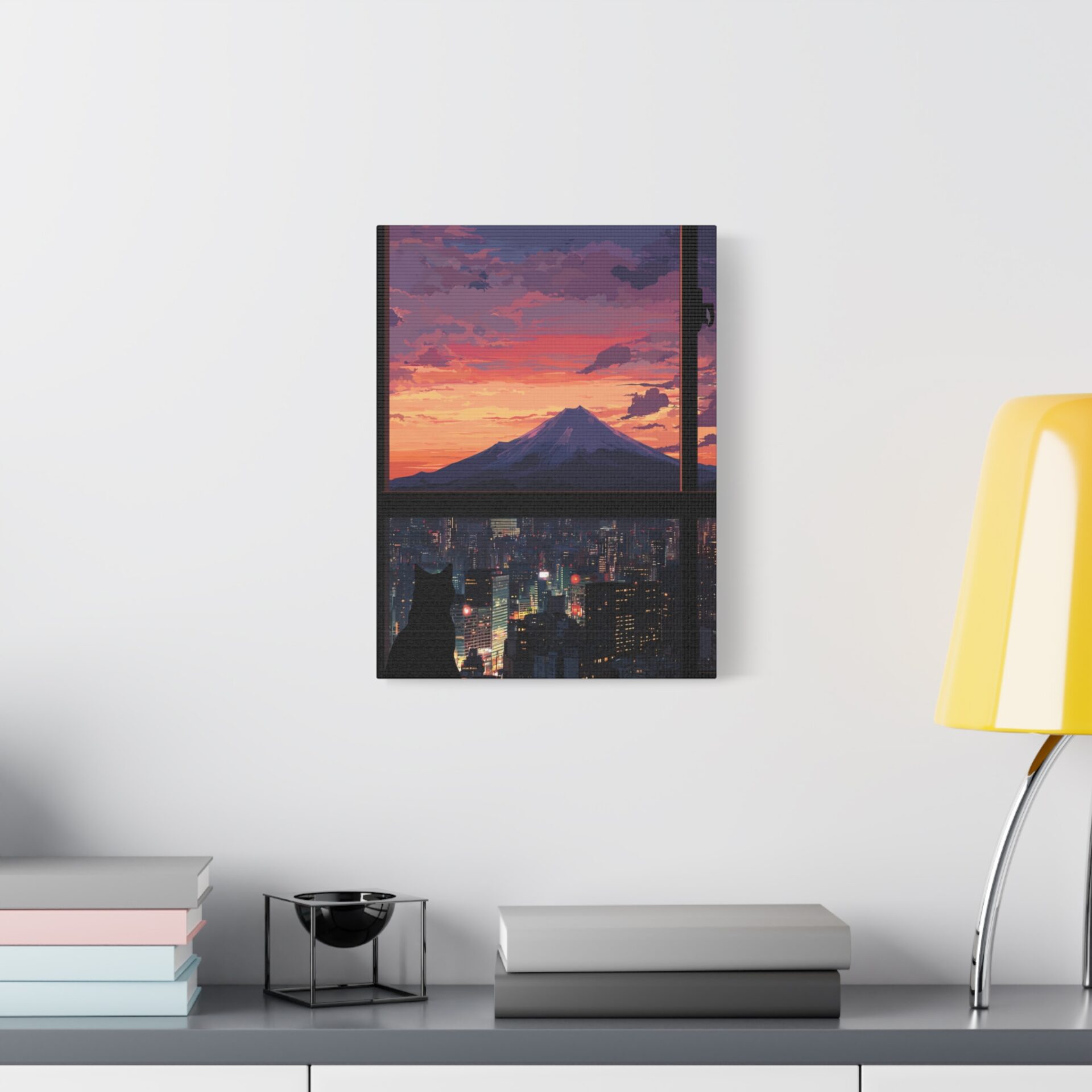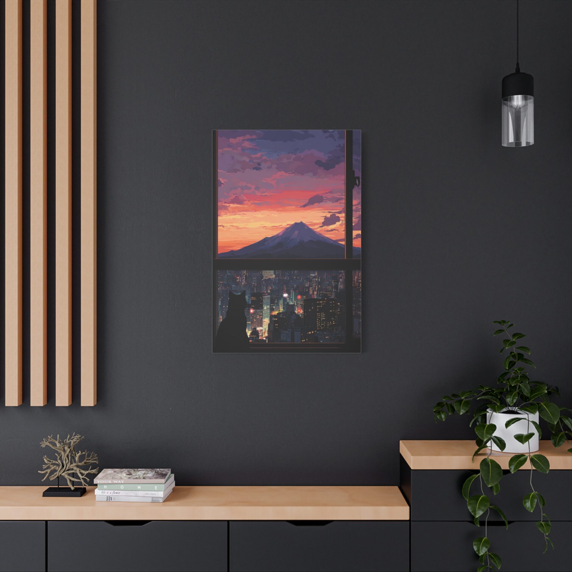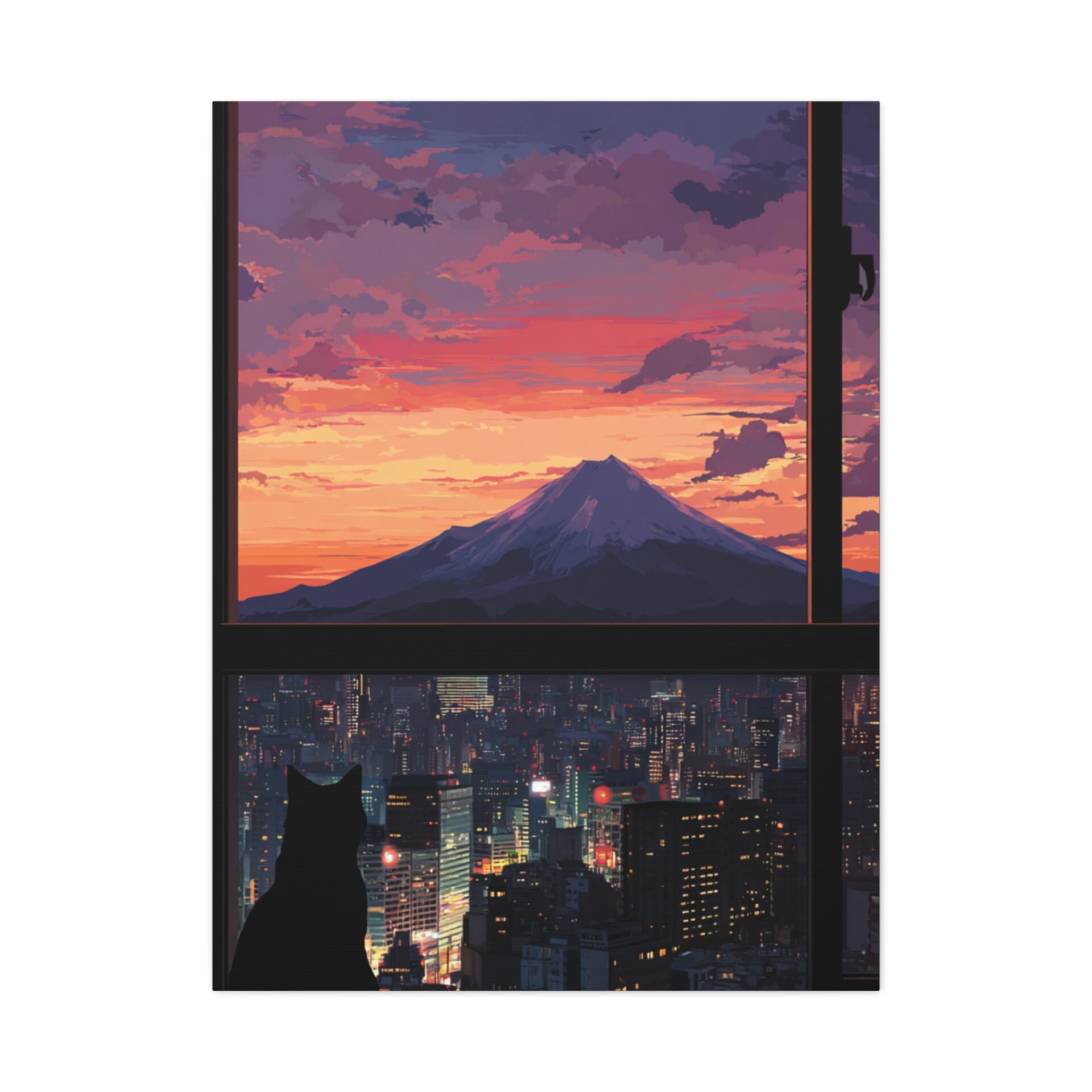 Plongez dans l’ambiance urbaine et chaleureuse de Tokyo avec ce tableau représentant la silhouette d’un chat noir assis sur le rebord d’une fenêtre. À l’arrière-plan, vous pouvez admirer une vue panoramique de la ville avec ses bâtiments illuminés et le majestueux mont Fuji à l’horizon. Le ciel est teinté de couleurs chaudes et vives, contrastant avec la fraîcheur de la nuit tokyoïte. Cette œuvre d’art, réalisée dans un style anime, apporte une atmosphère cosy à votre intérieur.