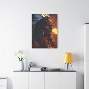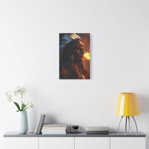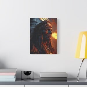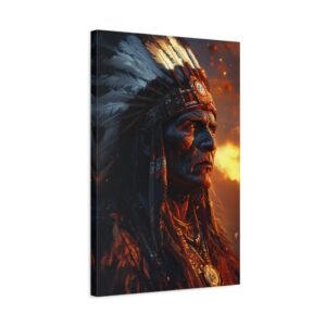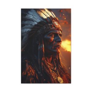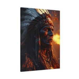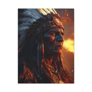 Laissez-vous transporter par la puissance mystique de cette œuvre d’art saisissante qui capture l’essence même de la culture amérindienne. Ce portrait majestueux d’un chef indien, paré de sa coiffe cérémonielle ornée de plumes d’aigle, apporte une présence noble et une intensité dramatique à votre intérieur.