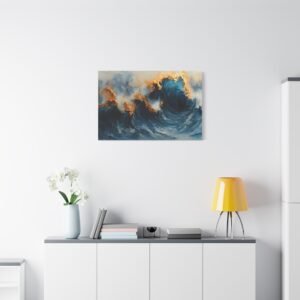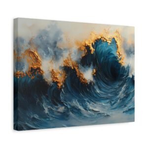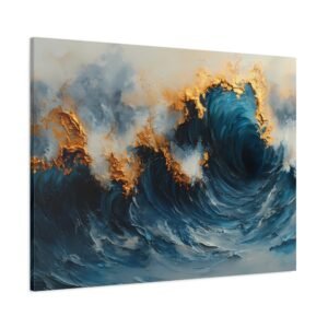 Succombez à la sophistication de ce tableau contemporain abstrait où les formes fluides se mêlent avec élégance. Les accents de bleu sarcelle profond et d’or créent une harmonie de couleurs luxueuse qui capte immédiatement le regard.