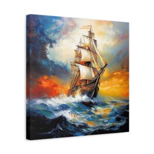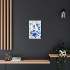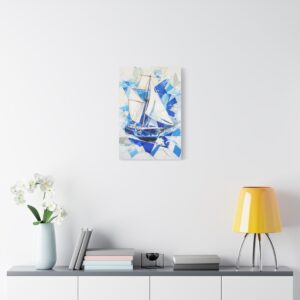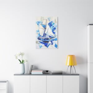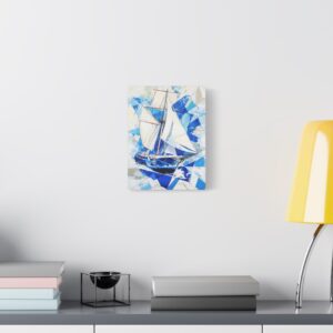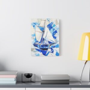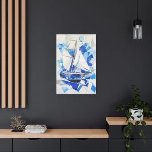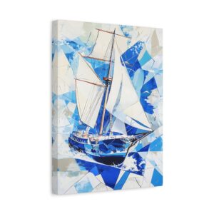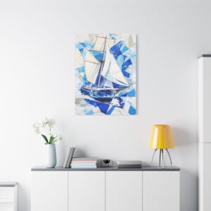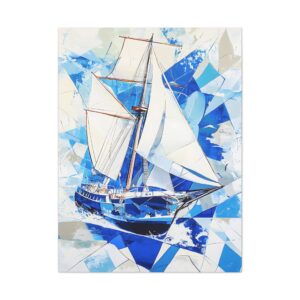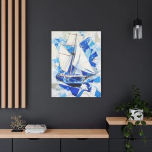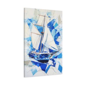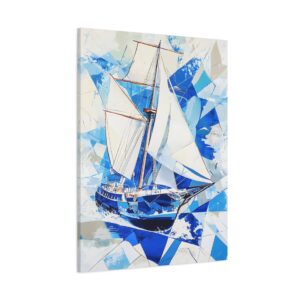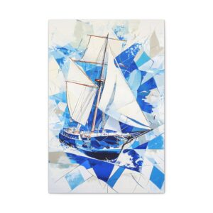 Découvrez cette interprétation artistique audacieuse d’un voilier, où les formes géométriques et les lignes fluides se rencontrent dans une danse abstraite. Les bleus vibrants et les blancs éclatants créent une composition dynamique qui capture l’essence même du mouvement maritime.
