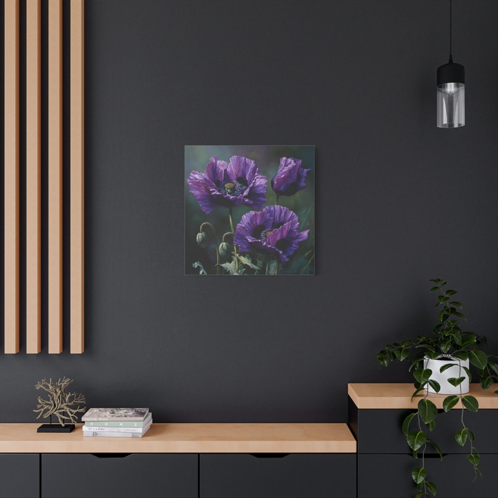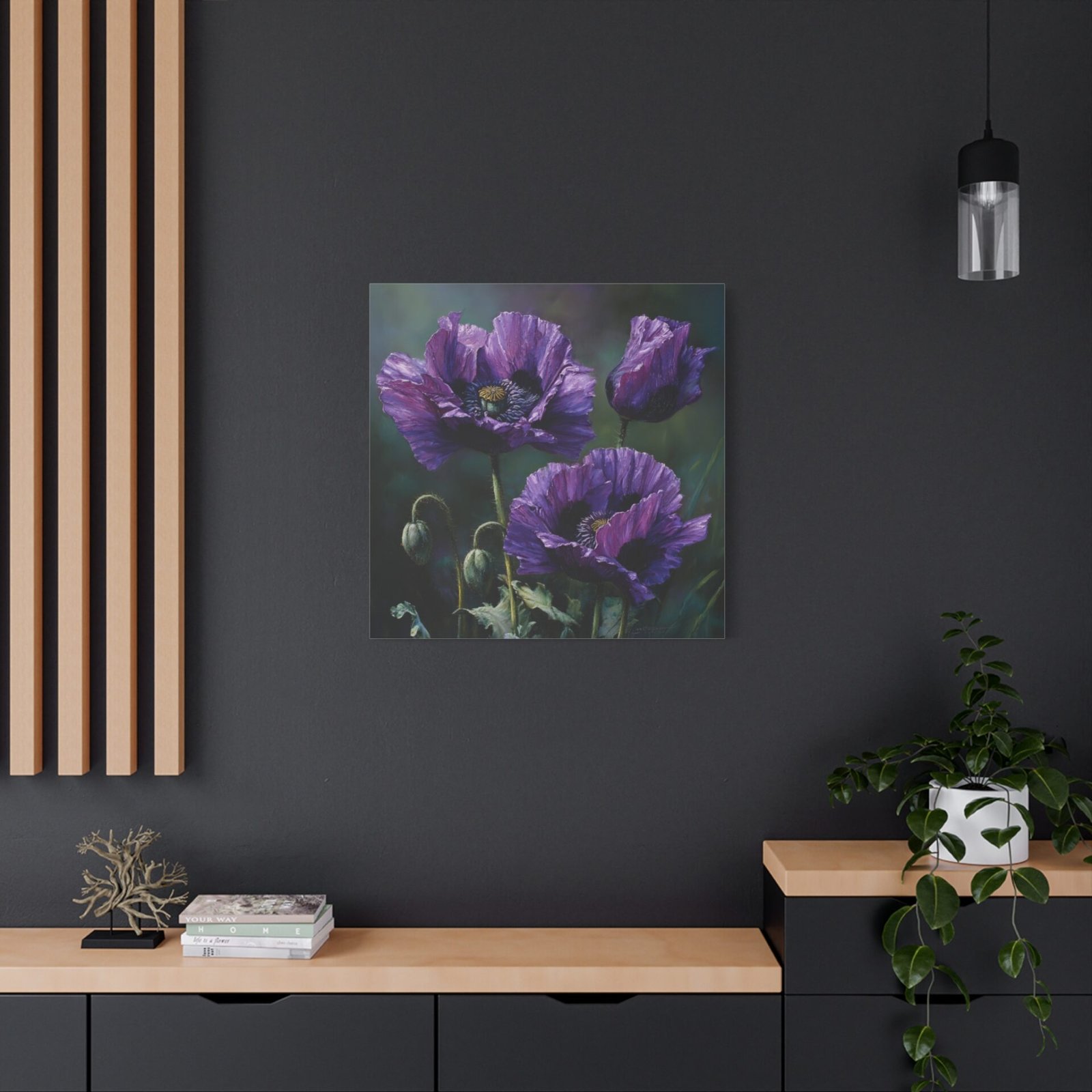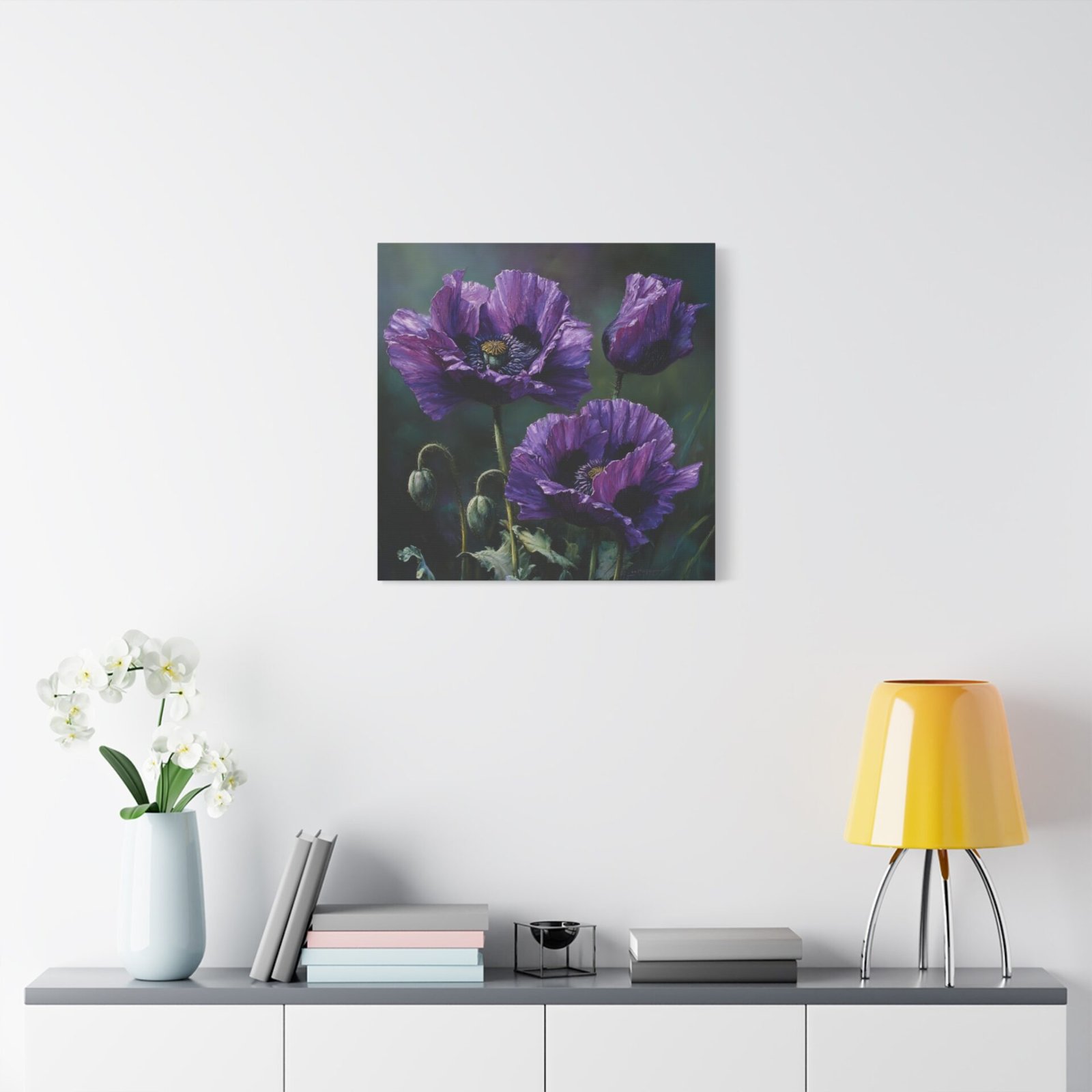 Découvrez la beauté inhabituelle des coquelicots violets avec ce tableau à l’huile saisissant. Peint dans un style botanique classique, il dépeint des fleurs en pleine floraison, leurs pétales profonds de violet et de lavande contrastant magnifiquement avec les tiges et les feuilles vert émeraude. Le tableau utilise une palette de couleurs riche en tons d’améthyste et de prune, avec un éclairage naturel doux qui crée de délicates ombres. Cette composition élégante met en valeur la beauté rare des coquelicots violets et donnera une touche d’originalité à votre décoration intérieure.