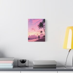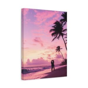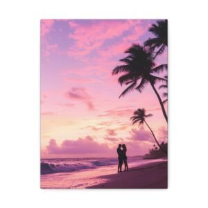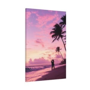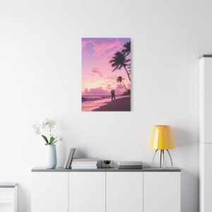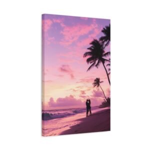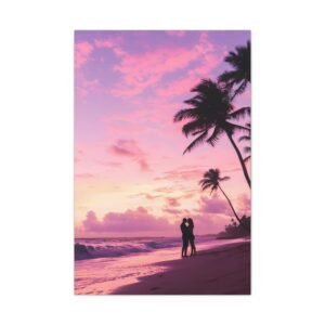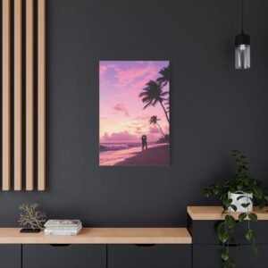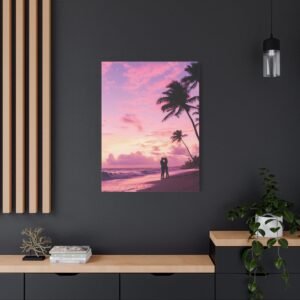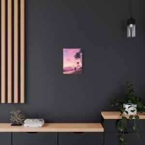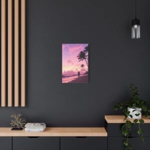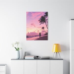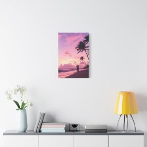 L’ambiance impressionniste envoûtante de cette œuvre sublime la scène de plage où les palmiers se balancent délicatement dans la brise marine. Les reflets du soleil couchant sur les vagues créent une atmosphère onirique, parfaite pour insuffler une touche de romance à votre intérieur.