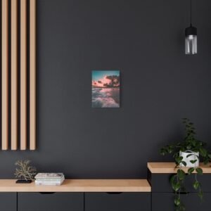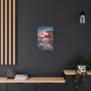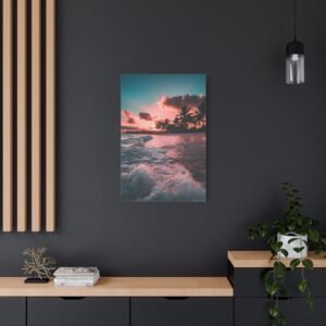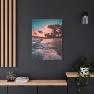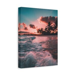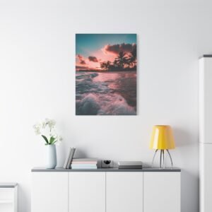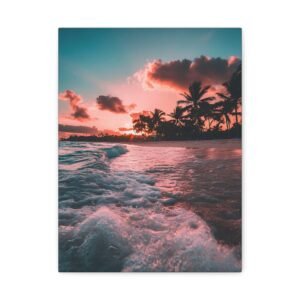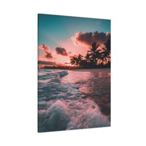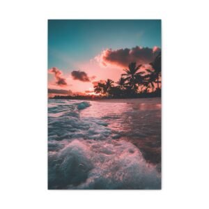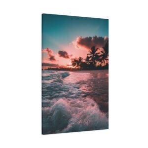 Les silhouettes élancées des palmiers se découpent avec grâce sur l’horizon, tandis que les vagues caressent doucement le sable immaculé. La lumière dorée du golden hour sublime chaque détail, créant une atmosphère de sérénité absolue qui transformera instantanément votre intérieur en havre de paix exotique.