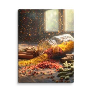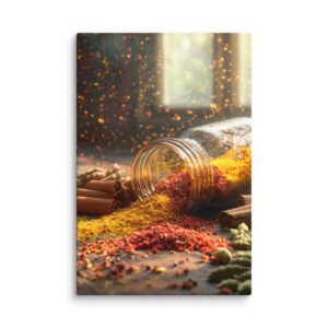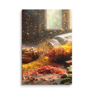 Imaginez un instant : des fils de safran s’échappant délicatement d’un bocal en verre renversé, entourés d’un arc-en-ciel de poudres colorées. Le rouge profond du paprika, l’or éclatant du curcuma, le vert tendre des gousses de cardamome et le brun chaleureux des bâtons de cannelle… Chaque nuance est minutieusement reproduite pour éveiller vos sens et stimuler votre créativité culinaire. 👨‍🍳✨