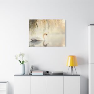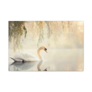 Plongez dans un instant de pure sérénité avec ce tableau d’un cygne majestueux au bord de l’eau. Les saules pleureurs se reflètent délicatement dans l’onde paisible, tandis que la brume matinale enveloppe la scène d’un voile romantique.