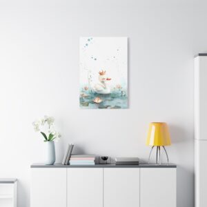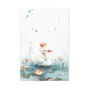 Apportez une touche de magie dans la chambre de votre enfant avec ce tableau enchanteur. Le petit cygne couronné, délicatement illustré dans un style aquarelle, évoque un univers féerique où se mêlent fleurs délicates et nénuphars. Les taches bleues subtiles et les étoiles flottantes créent une atmosphère douce et onirique parfaite pour les rêveries enfantines.
