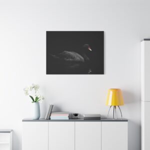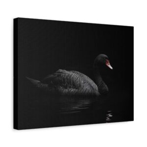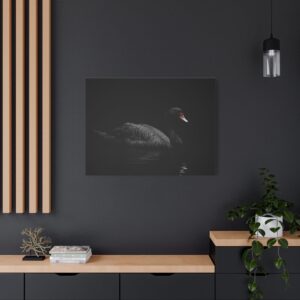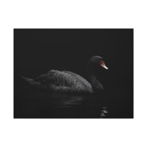 Découvrez la beauté saisissante de ce tableau minimaliste du cygne noir, où le jeu de clair-obscur crée un drame visuel captivant. Les reflets iridescents sur les plumes sombres se révèlent subtilement dans l’eau noire, créant une composition d’une rare intensité.