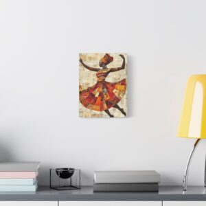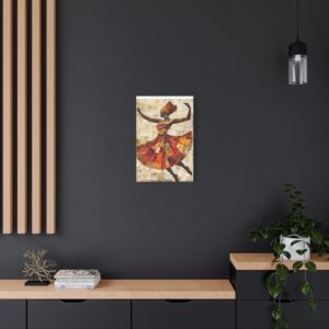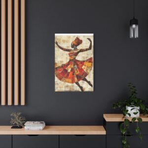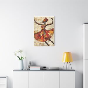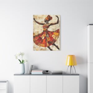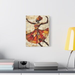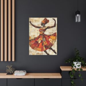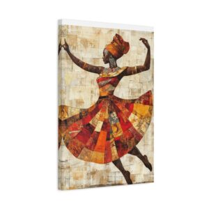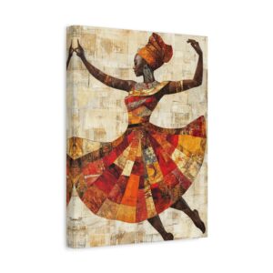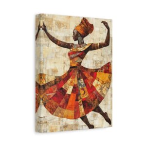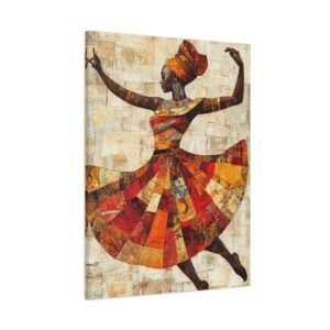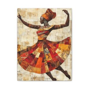 La composition dynamique met en scène un danseur en costume traditionnel, dont la gestuelle puissante est sublimée par des coups de pinceau audacieux. Les motifs géométriques et les textures inspirées des textiles africains créent une profondeur visuelle captivante, tandis que l’éclairage dramatique renforce l’intensité de la scène.