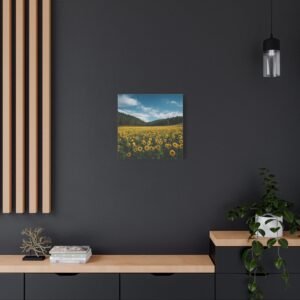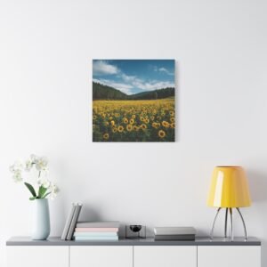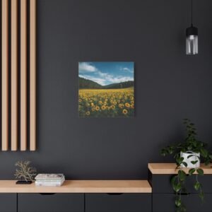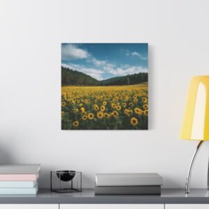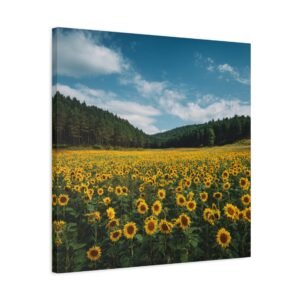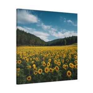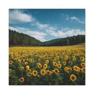 Découvrez ce tableau de Champ de Tournesols avec Foret, une photographie haute résolution époustouflante d’un vaste champ de tournesols s’étendant jusqu’à la lisière d’une forêt dense. Des milliers de tournesols dorés en rangées parfaites font face à la caméra, leur riche feuillage vert créant des textures naturelles. En toile de fond, de grands pins et chênes forment un bois sombre, contrastant avec le ciel bleu d’été parsemé de nuages blancs. La lumière naturelle du soleil projette des ombres réalistes, ajoutant à la profondeur et au détail de cette image pastorale.