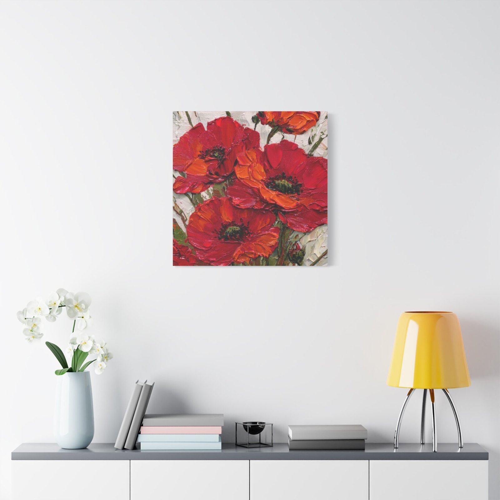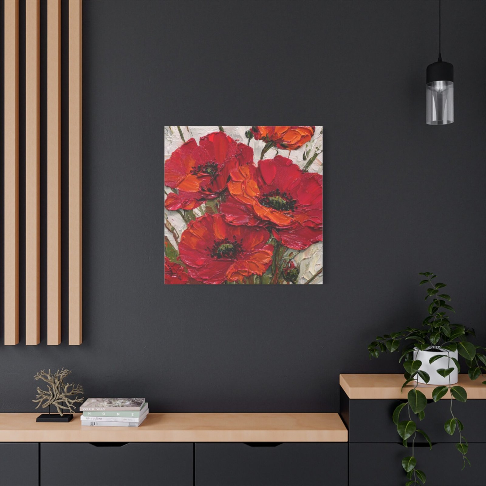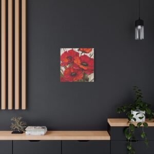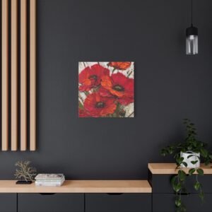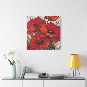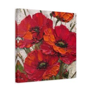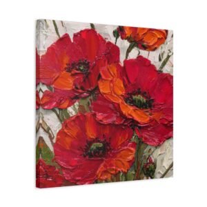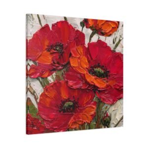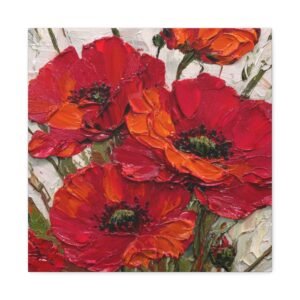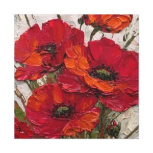 Découvrez ce tableau de coquelicots au couteau, une œuvre d’art à l’huile dramatique de coquelicots rouge vif créée entièrement avec la technique du couteau à palette. L’application épaisse de peinture impasto crée une texture riche et une dimension, avec des coups de pinceau sculpturaux audacieux qui construisent des couches de pigments cramoisis et écarlates. Le travail expressif du couteau montre des crêtes et des sommets visibles dans la peinture, avec une composition dynamique et des éléments texturaux lourds. Cette technique artistique met l’accent sur les propriétés physiques de la peinture à l’huile.