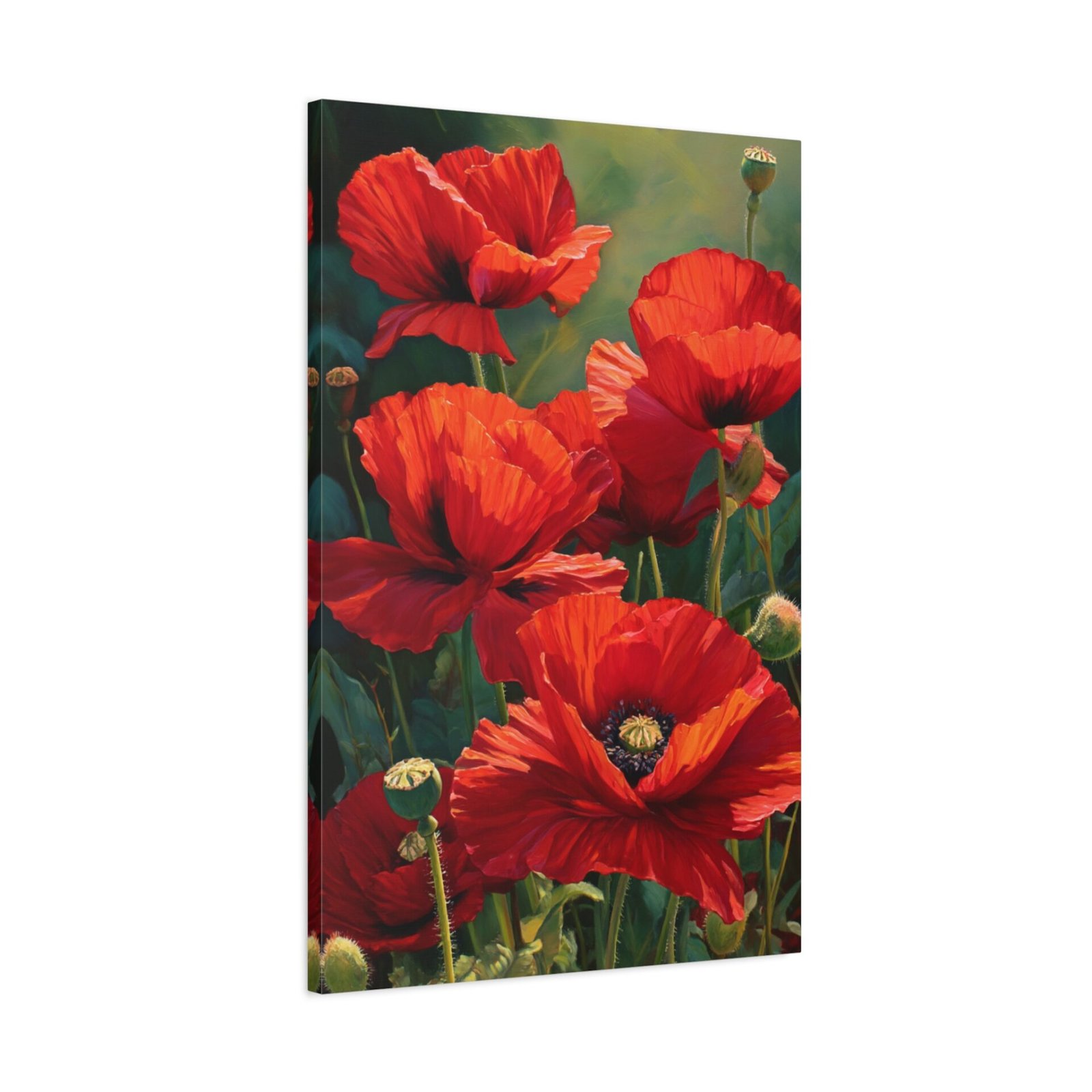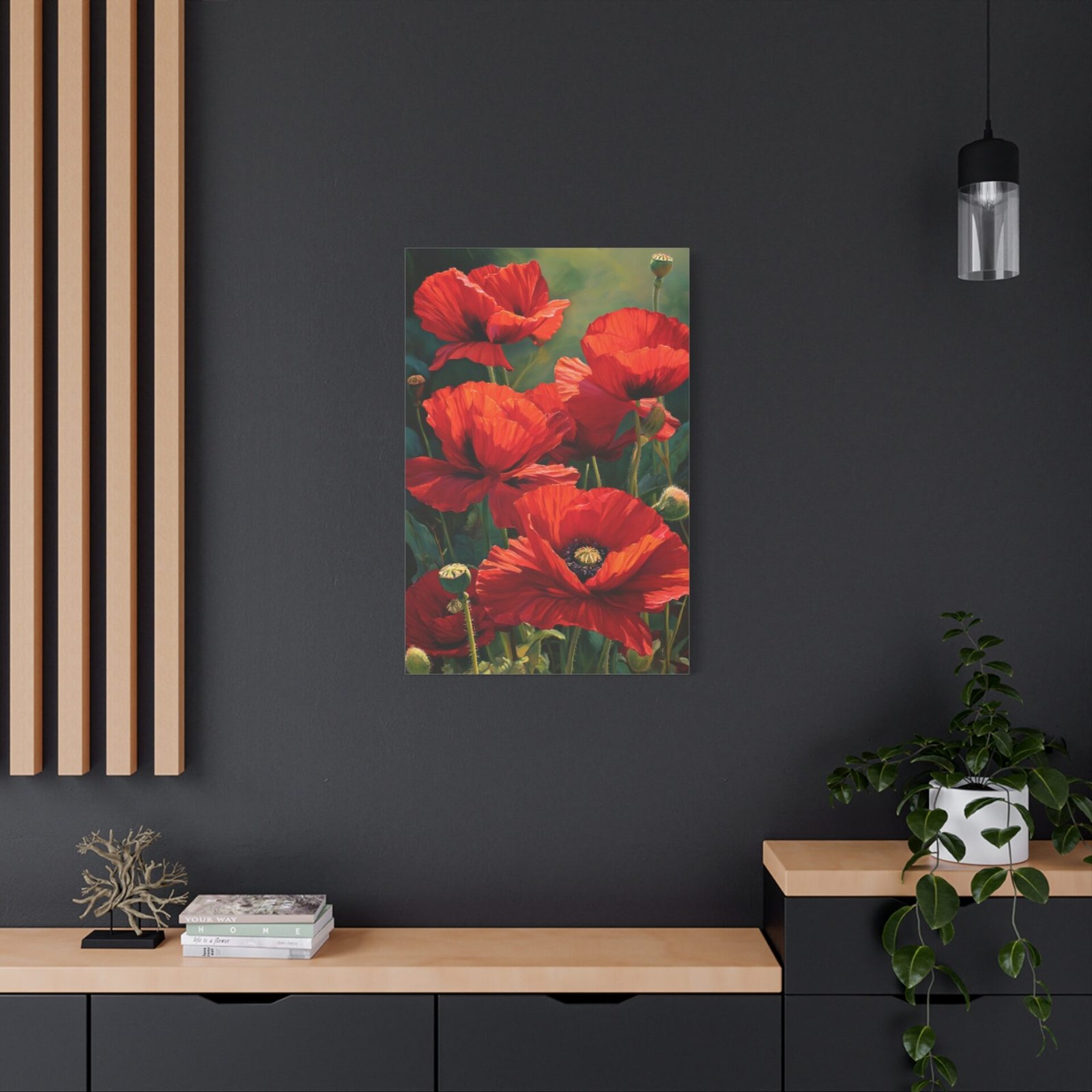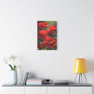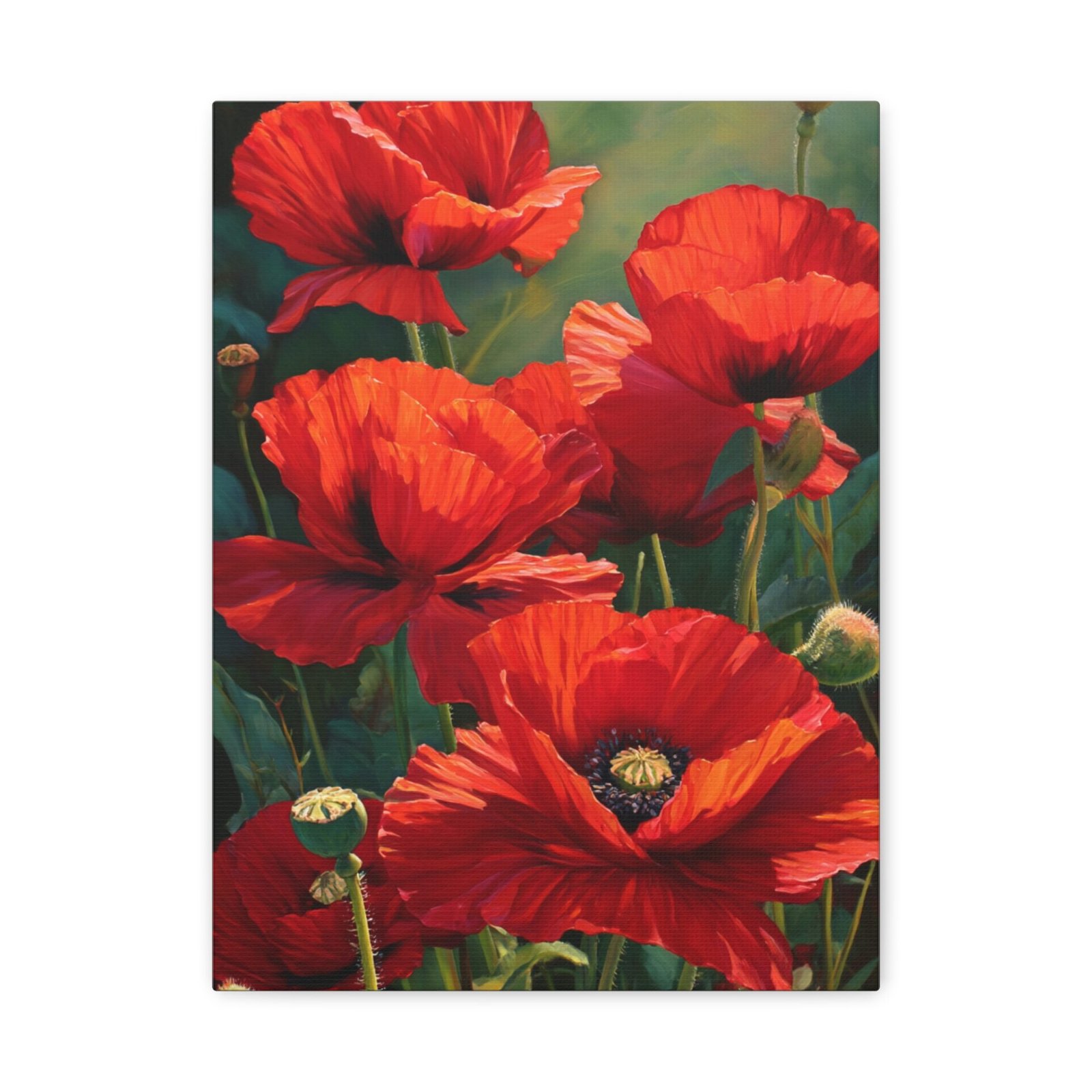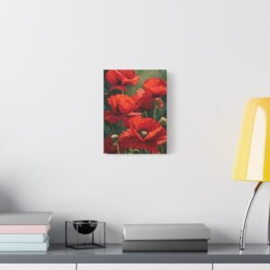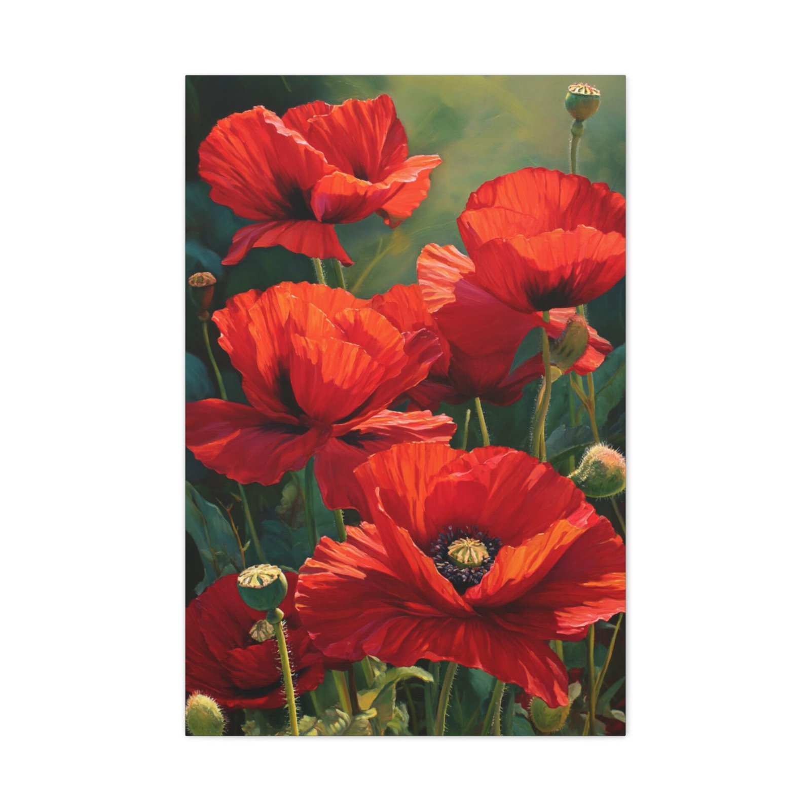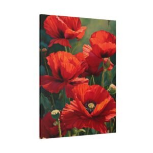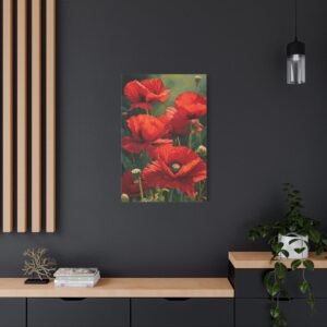 Imaginez un tableau d’huile vibrant de coquelicots rouges brillants à divers stades de floraison. Les pétales écarlates et cramoisis avec des centres noirs délicats, peints dans un style réaliste classique avec un travail de pinceau fin et une attention aux détails. Le tableau est situé dans un cadre de jardin naturel avec un feuillage vert doux, la lumière chaude du soleil améliorant les couleurs rouges lumineuses. C’est une représentation traditionnelle de l’art botanique avec une saturation de couleur riche et des ombres réalistes.