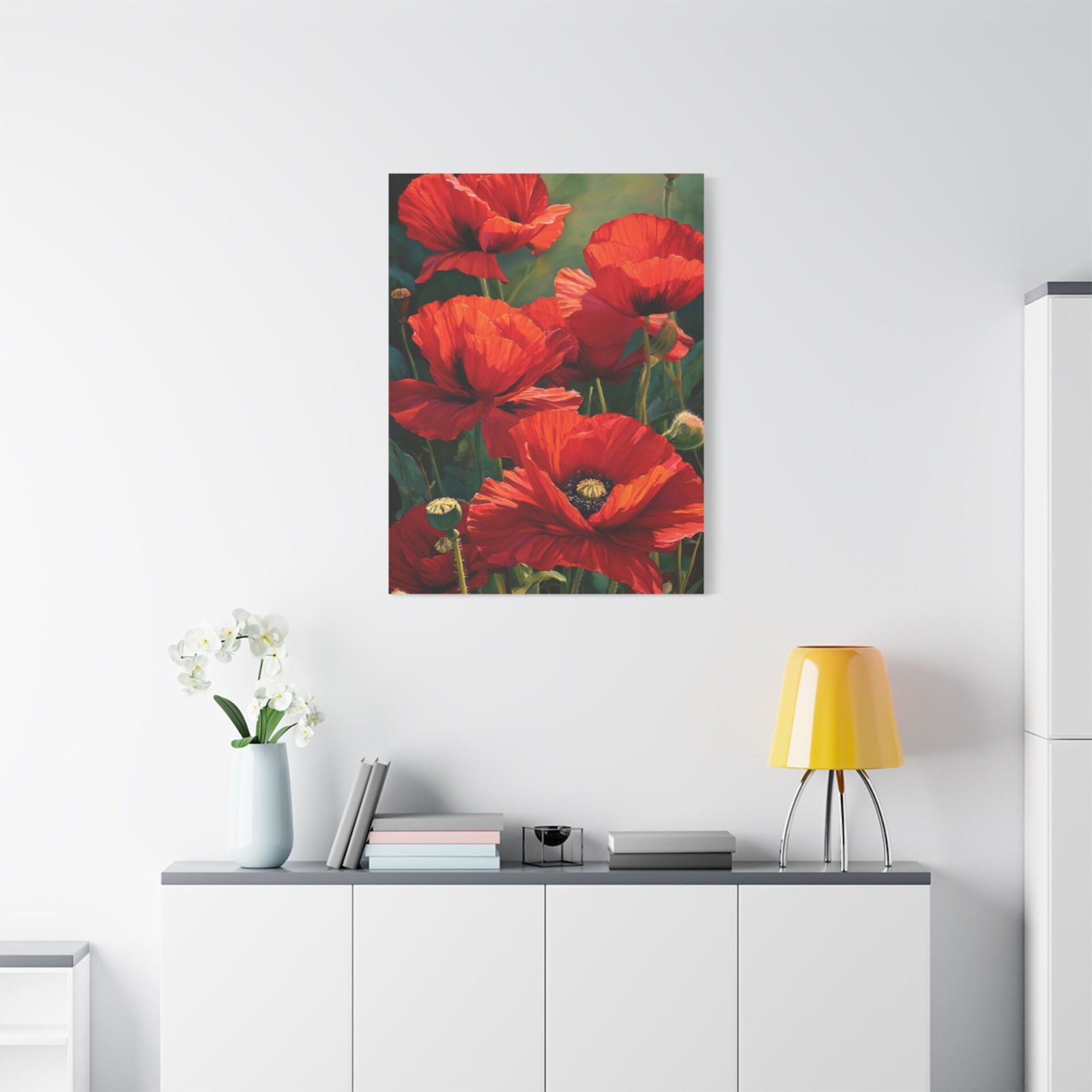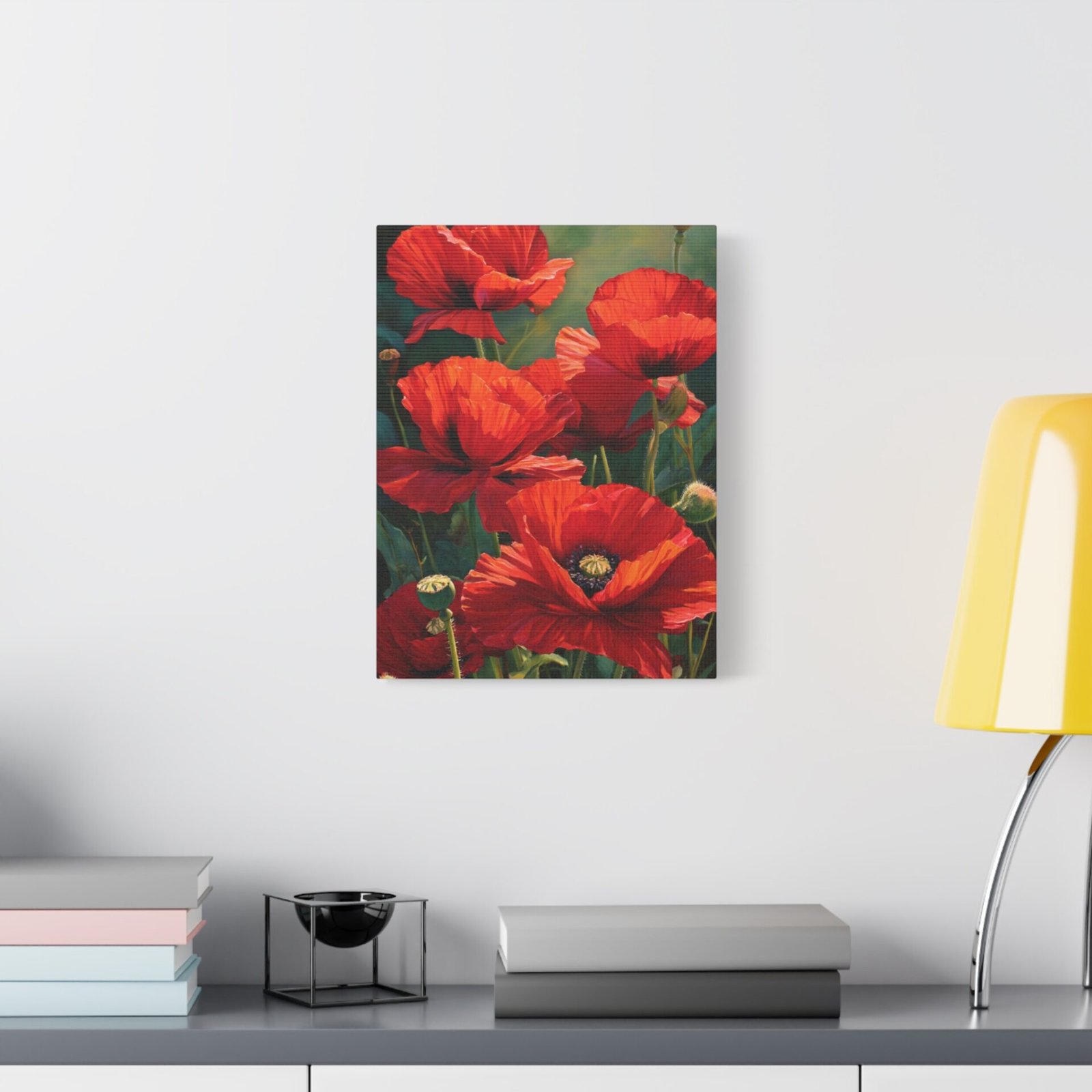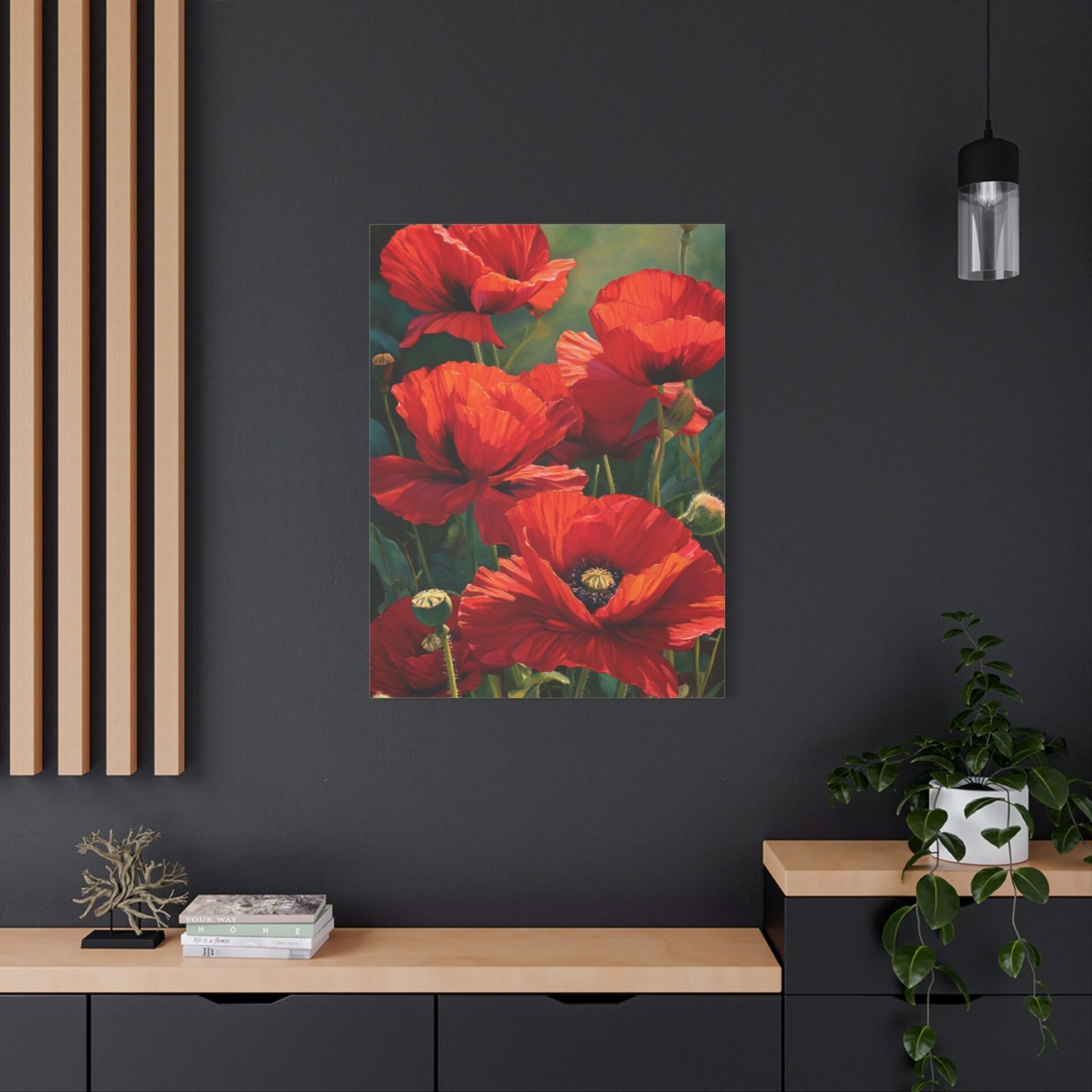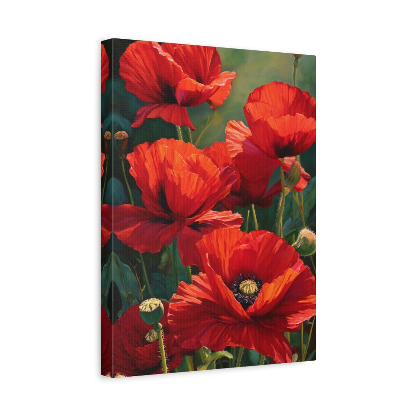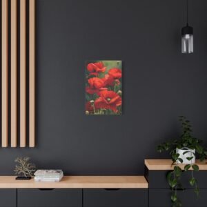 Imaginez un tableau d’huile vibrant de coquelicots rouges brillants à divers stades de floraison. Les pétales écarlates et cramoisis avec des centres noirs délicats, peints dans un style réaliste classique avec un travail de pinceau fin et une attention aux détails. Le tableau est situé dans un cadre de jardin naturel avec un feuillage vert doux, la lumière chaude du soleil améliorant les couleurs rouges lumineuses. C’est une représentation traditionnelle de l’art botanique avec une saturation de couleur riche et des ombres réalistes.