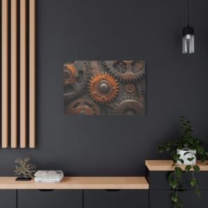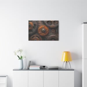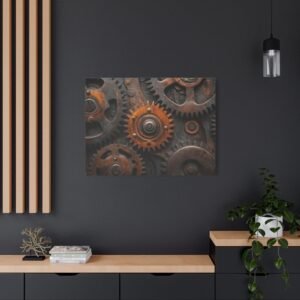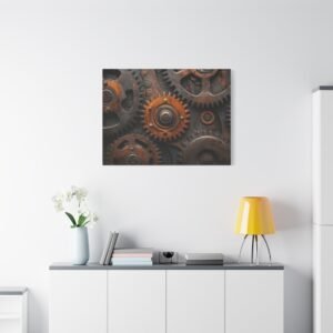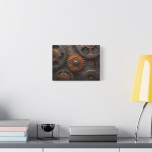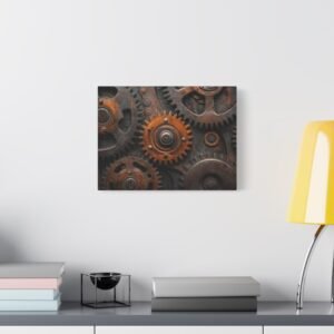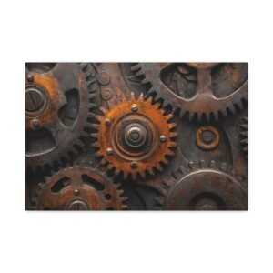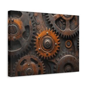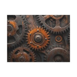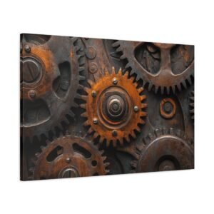 Découvrez la beauté mécanique de ce tableau captivant où les engrenages s’entrelacent dans une danse perpétuelle. Les reflets métalliques et les tons bronze-cuivre créent une symphonie visuelle dynamique qui insuffle vie et mouvement à votre espace.