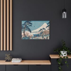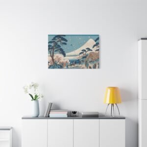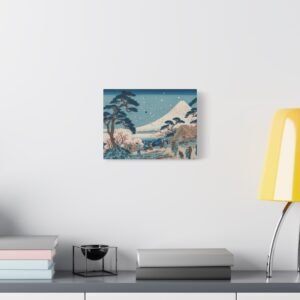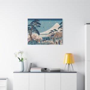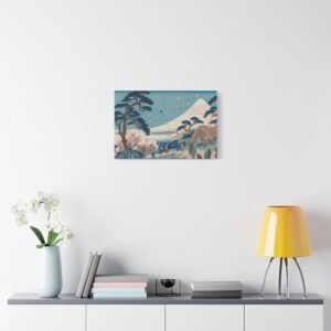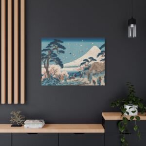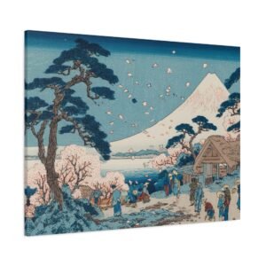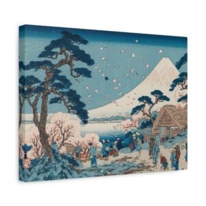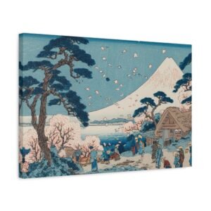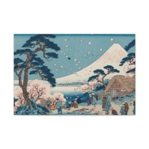Découvrez ce magnifique Tableau estampe ukiyo-e, représentant des voyageurs sur la route de Tokaido à Ejiri. Le majestueux Mont Fuji s’élève en toile de fond, tandis que des cerisiers en fleurs sont éparpillés par de forts vents. On y voit des marchands et des pèlerins marchant le long du sentier côtier, des pins japonais traditionnels se courbant sous le vent, des papiers et des chapeaux volant à travers l’air. Peint dans le style de Hokusai avec des bleus audacieux, des tons terre chauds et de délicats accents roses, ce tableau offre une esthétique de l’époque Edo authentique avec de fins détails linéaires et des plans de couleur plats.