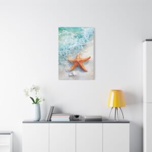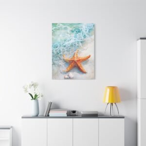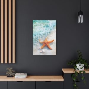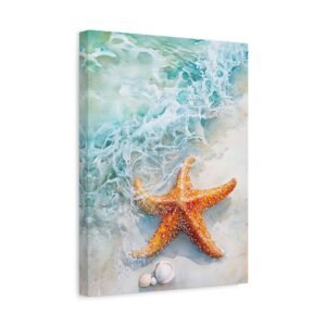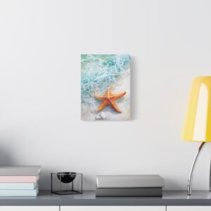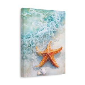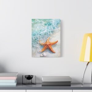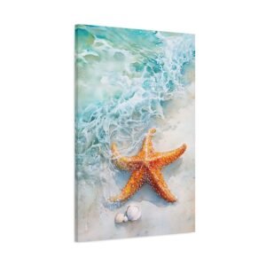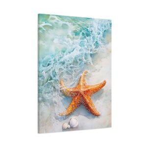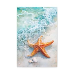 Plongez dans un univers marin raffiné avec cette aquarelle délicate mettant en scène une étoile de mer orangée sur un lit de sable immaculé. Les reflets turquoise de l’eau créent une atmosphère apaisante, tandis que les fragments de coquillages dispersés racontent une histoire marine enchanteresse.