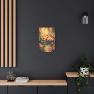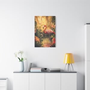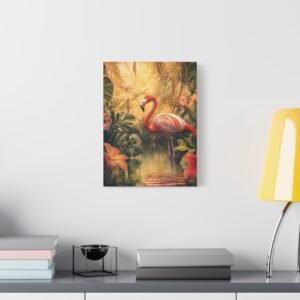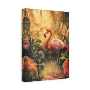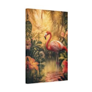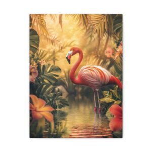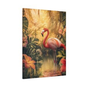 Transportez-vous instantanément dans un paradis tropical avec cette composition envoûtante d’un flamant rose majestueux. Les teintes vibrantes et la lumière dorée capturent parfaitement l’élégance naturelle de cet oiseau emblématique, sublimé par un décor luxuriant de fleurs exotiques.