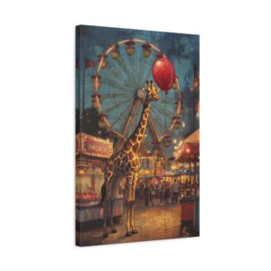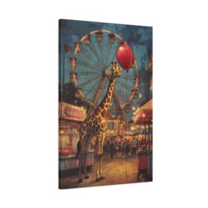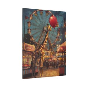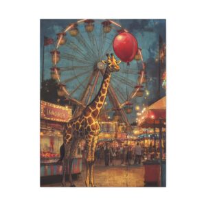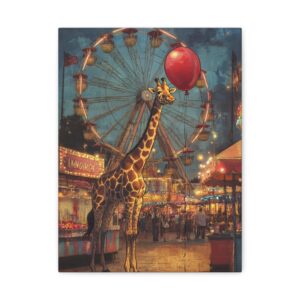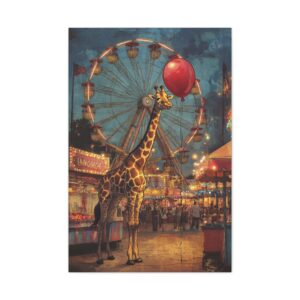 Plongez dans l’univers enchanteur de cette composition vintage unique où une adorable girafe s’aventure dans une fête foraine baignée de lumière dorée. Le mélange des styles entre le réalisme du décor et le charme whimsique du personnage crée une atmosphère nostalgique irrésistible.