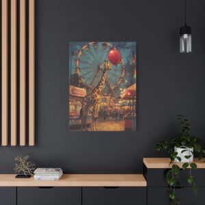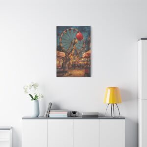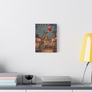 Cette œuvre apporte une touche de fantaisie poétique idéale pour une chambre d’enfant, un salon chaleureux ou un espace créatif. Les tons vibrants et la douce luminosité s’harmonisent parfaitement avec une décoration vintage ou contemporaine. Le contraste entre la grande roue atmosphérique et la scène attendrissante du ballon rouge capture instantanément l’attention.