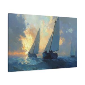 Laissez-vous transporter par cette œuvre impressionniste saisissante où voiliers et lumière se fondent dans une danse crépusculaire. Les coups de pinceau vibrants capturent magistralement la rencontre entre le ciel flamboyant et l’océan miroitant, créant une atmosphère digne des plus grands maîtres.