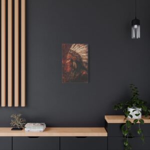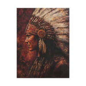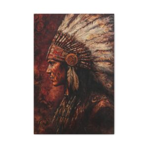 Laissez-vous captiver par la grandeur majestueuse de ce portrait saisissant qui incarne l’essence même de la noblesse amérindienne. Le profil du chef, paré de sa coiffe cérémonielle, se découpe avec une présence magnétique qui transforme instantanément votre espace en galerie d’art ethnique.