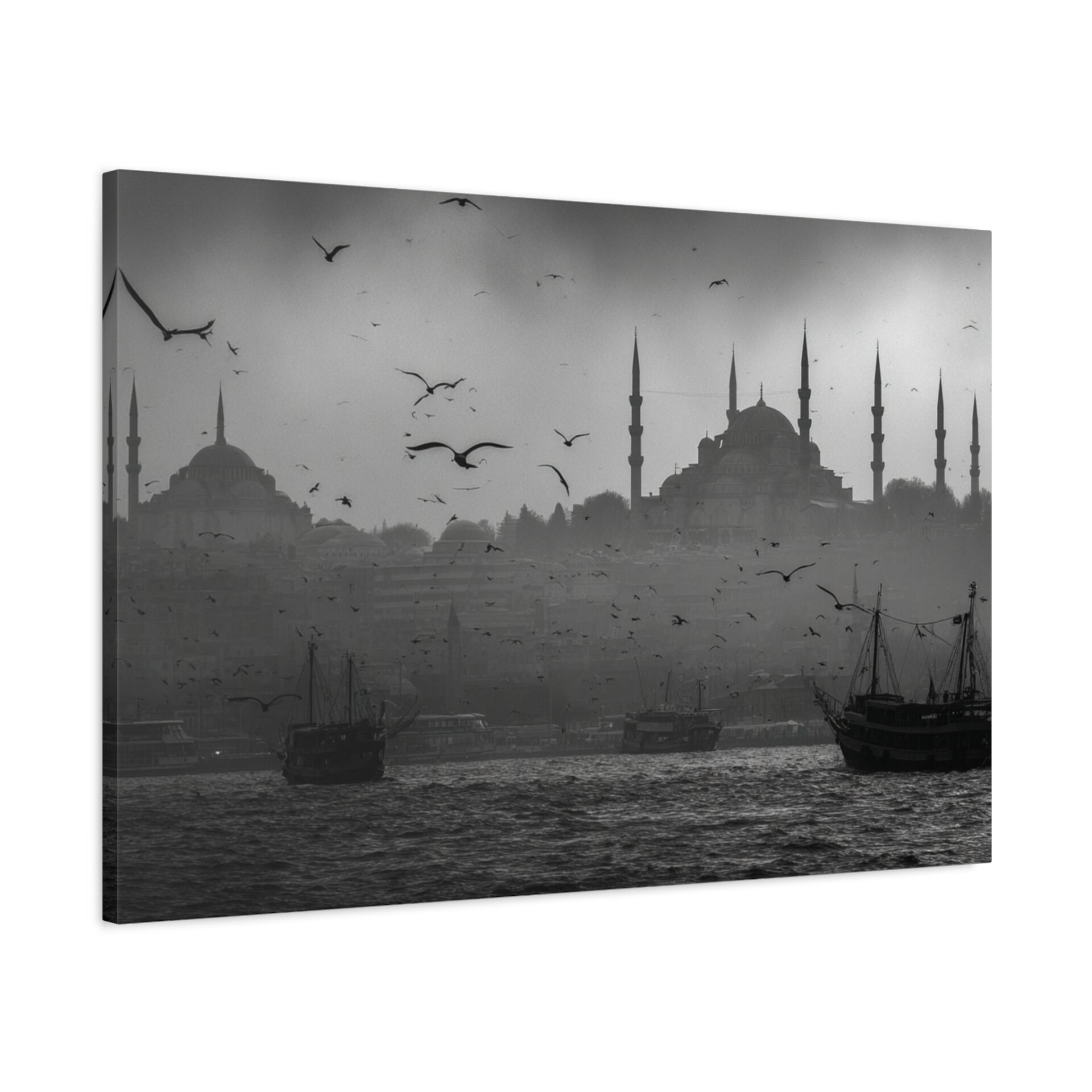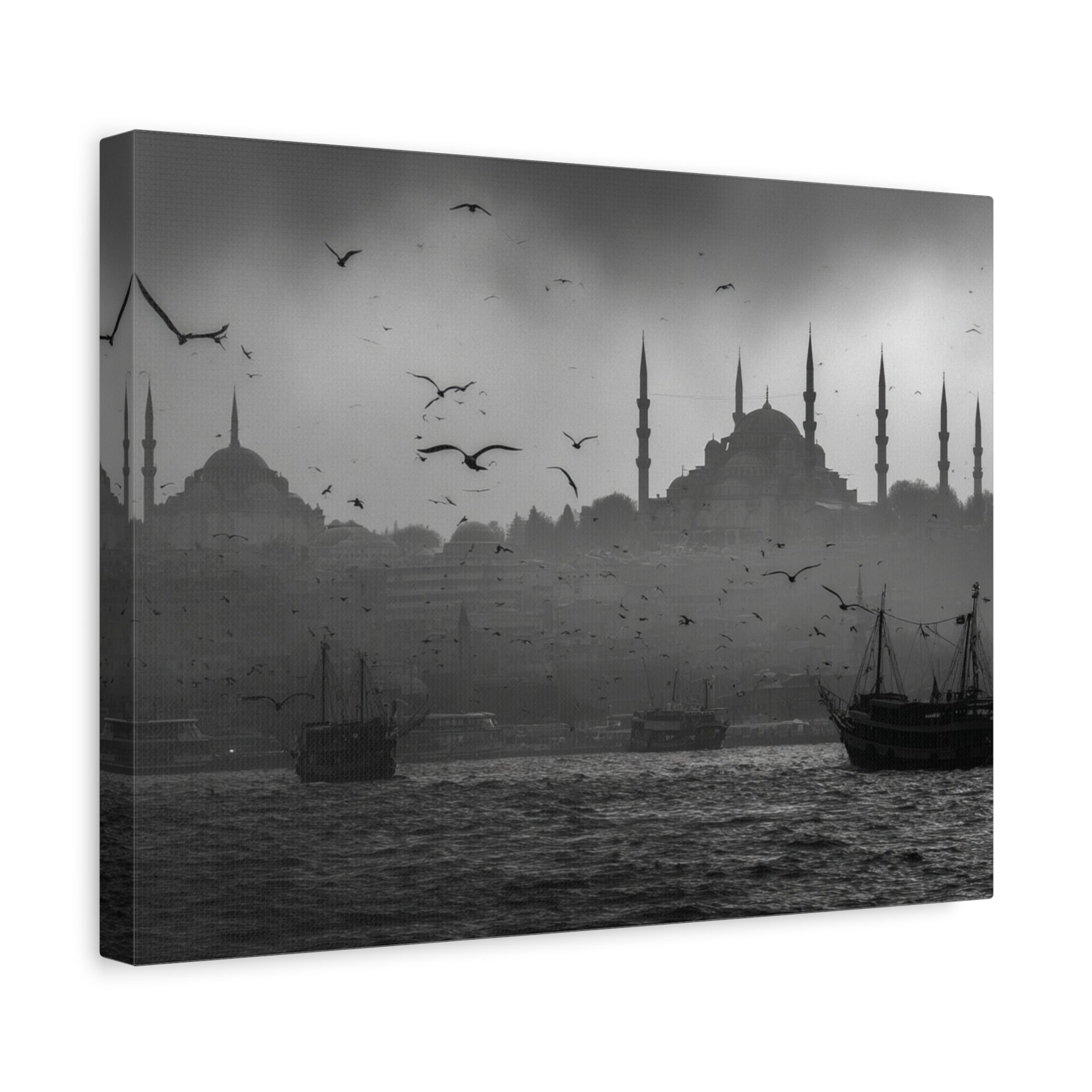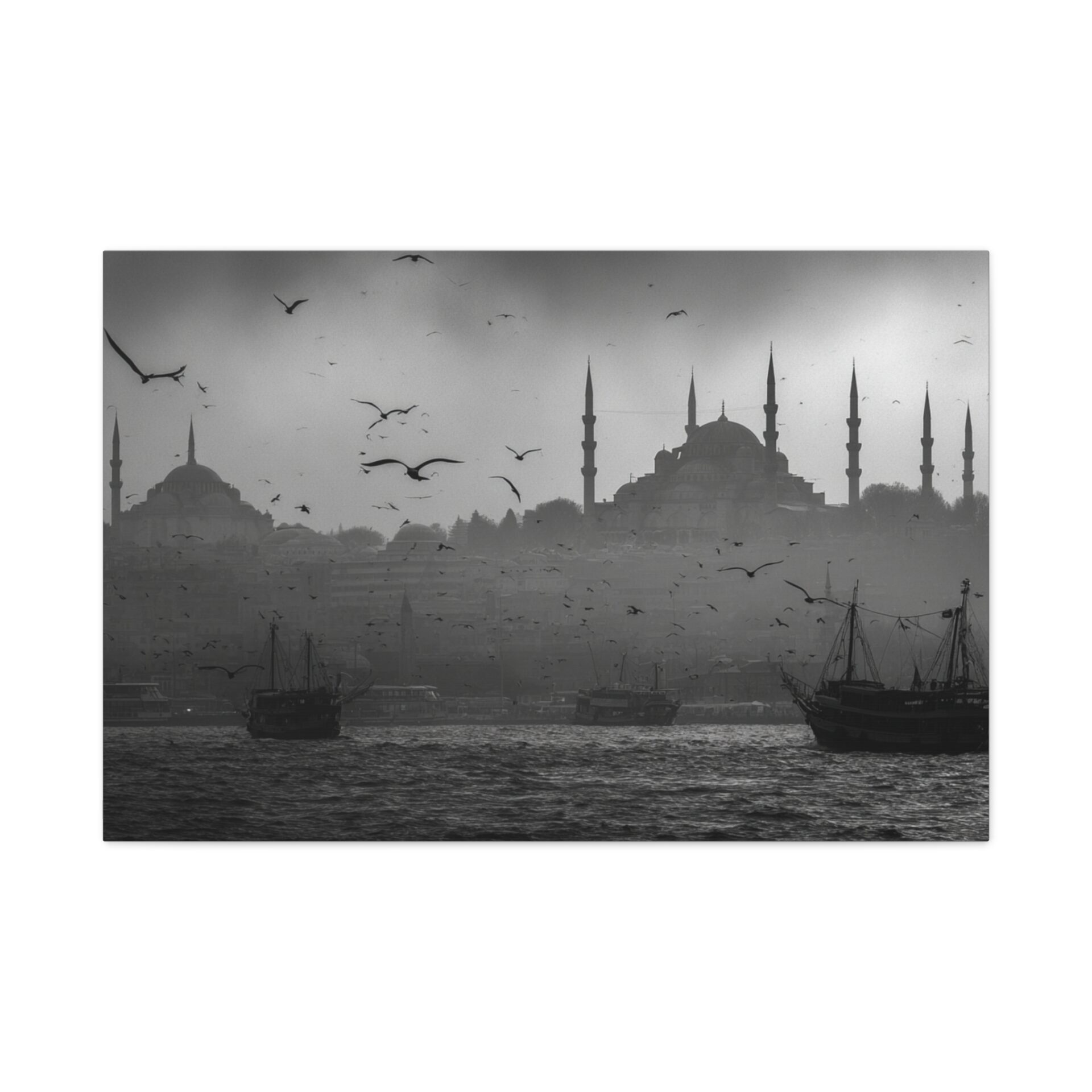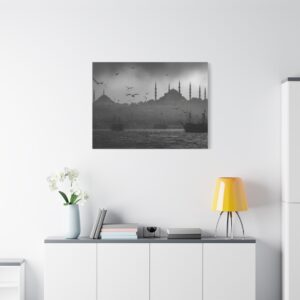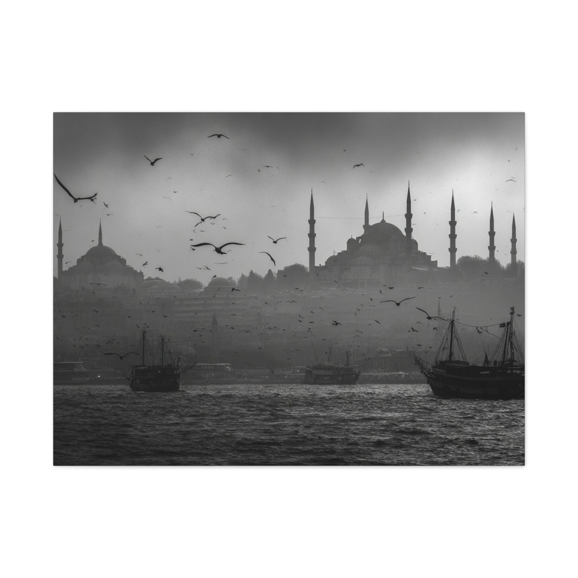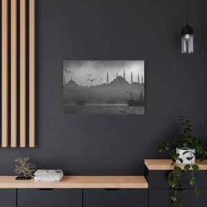 Ce Tableau Istanbul Noir & Blanc capture l’essence mystique de la ville avec une élégance cinématographique. Les silhouettes de la Hagia Sophia et de la Mosquée Bleue se détachent sur le détroit du Bosphore, leurs minarets ottomans perçant un ciel brumeux. Des bateaux de pêche traditionnels sont ancrés dans le premier plan, ajoutant une touche de nostalgie à la scène. Le tableau est dominé par une lumière atmosphérique, créant des ombres dramatiques et un contraste saisissant. Les mouettes volent au-dessus, complétant ce tableau de voyage en beaux-arts.