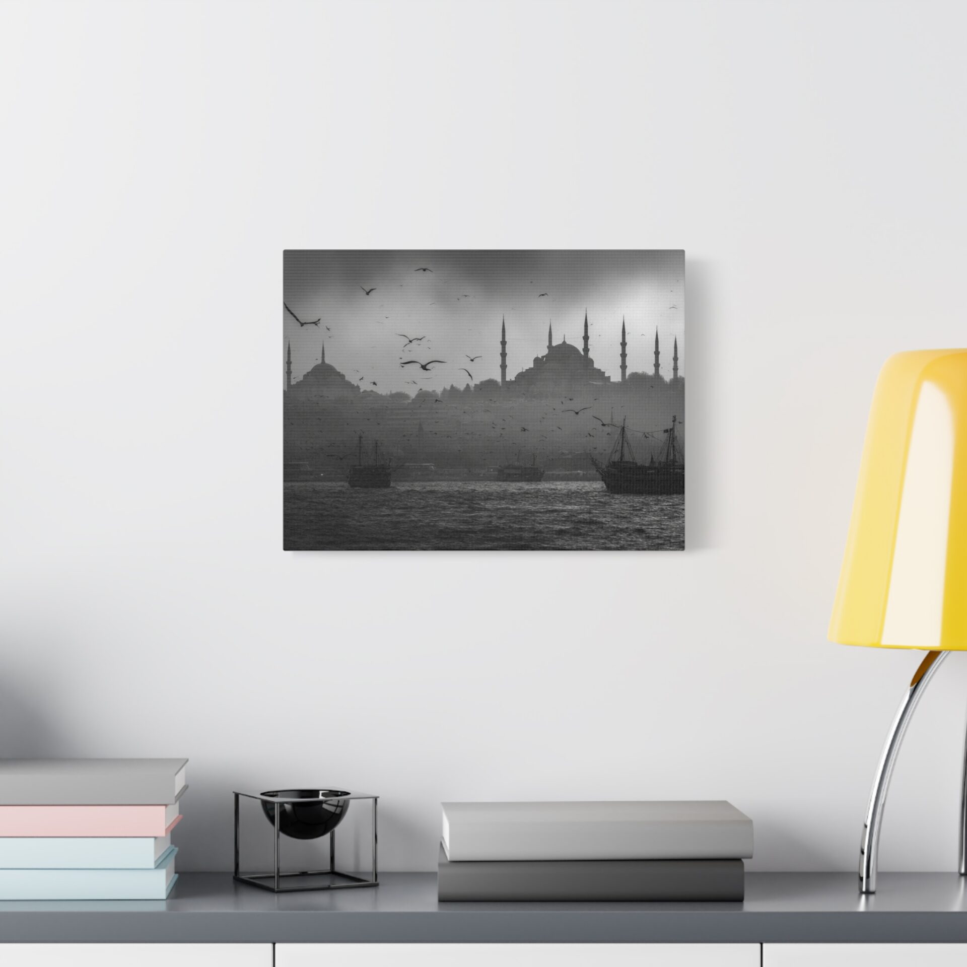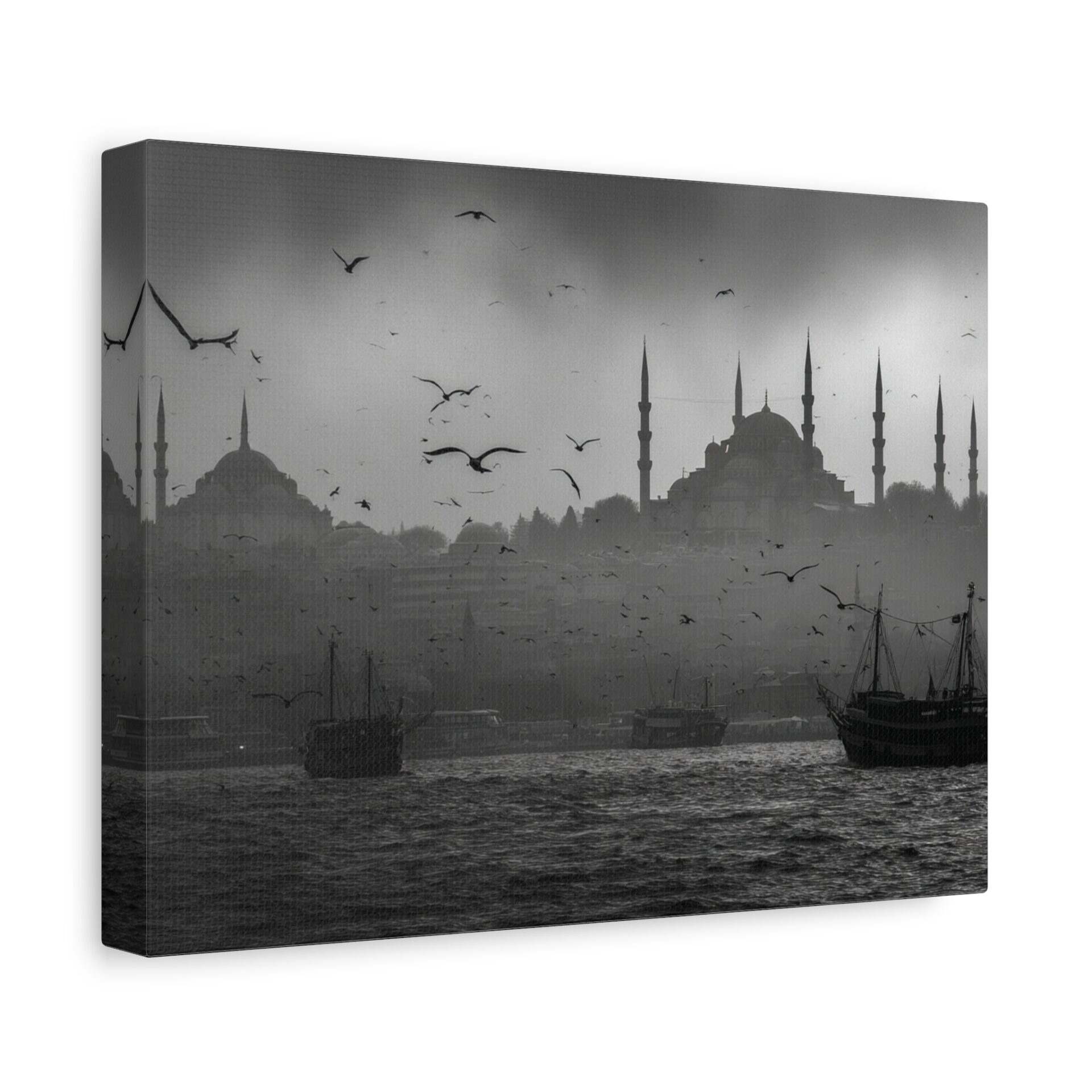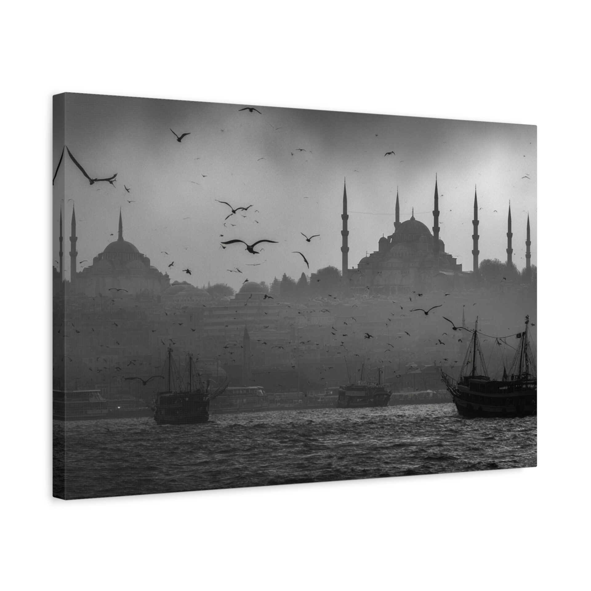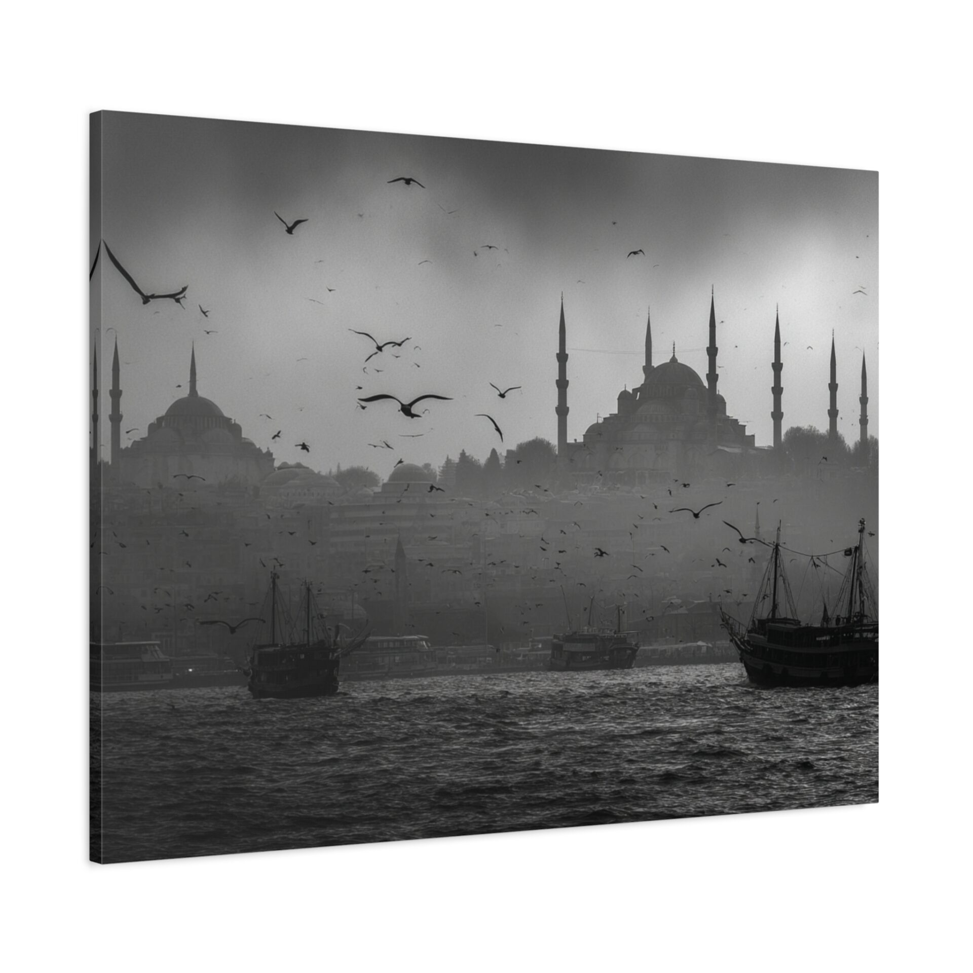 Ce Tableau Istanbul Noir & Blanc capture l’essence mystique de la ville avec une élégance cinématographique. Les silhouettes de la Hagia Sophia et de la Mosquée Bleue se détachent sur le détroit du Bosphore, leurs minarets ottomans perçant un ciel brumeux. Des bateaux de pêche traditionnels sont ancrés dans le premier plan, ajoutant une touche de nostalgie à la scène. Le tableau est dominé par une lumière atmosphérique, créant des ombres dramatiques et un contraste saisissant. Les mouettes volent au-dessus, complétant ce tableau de voyage en beaux-arts.
