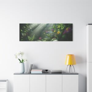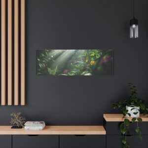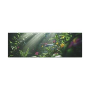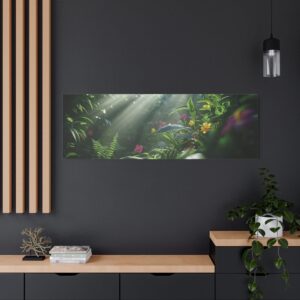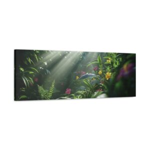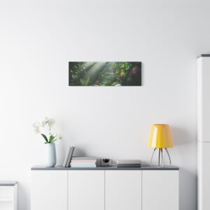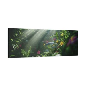 Plongez dans l’ambiance luxuriante d’une forêt tropicale mystérieuse avec ce panorama saisissant. Les rayons de soleil percent délicatement la canopée dense, créant un jeu de lumière fascinant qui donnera vie à votre intérieur.
